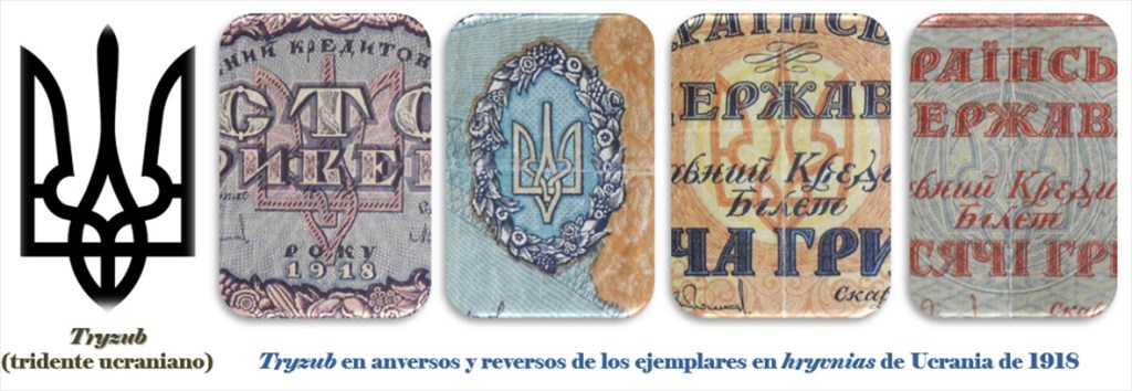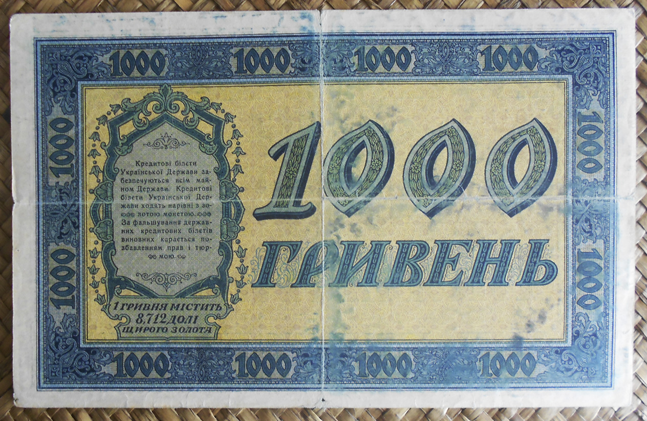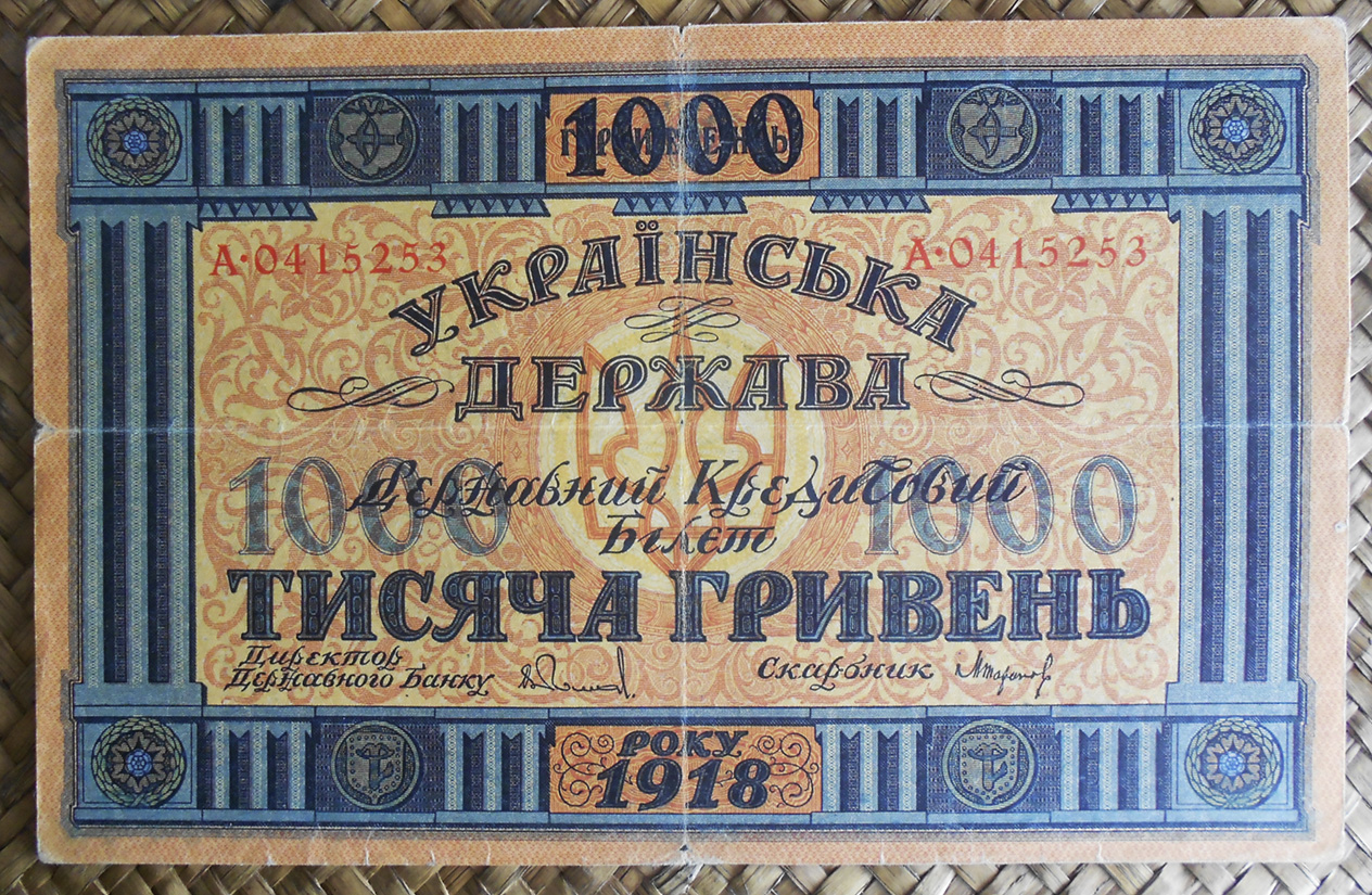 El billete de 1.000 grivnas de Ucrania –Crédito estatal de 1918 nos ofrece en su anverso un marco recto formado por columnas y frisos clásicos que alternan trigifos (o tablillas verticales acanaladas) con metopas con distintas decoraciones (rosetones en las esquinas, mapas o blasones heráldicos arriba y al pie). El tryzub se dibuja dentro de una corona central rodeada de ornamentaciones vegetales. En este lado los números de serie, por duplicado y en horizontal, en tipografía roja. Cromaticidad azul, naranja y amarilla delante y azul, verde y amarilla al reverso.