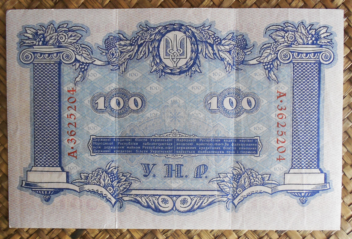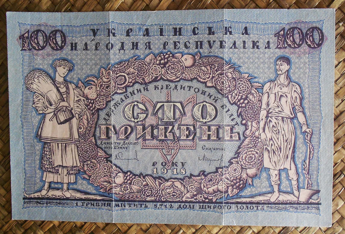 El billete de 100 grivnas de Ucrania –Crédito estatal de 1918 nos ofrece al anverso un grabado con dos alegorías laterales, una mujer enjoyada que sostiene una gavilla de cereal y un varón con una especie de pala con un cordón de hojas. Ambos se posan sobre una corona de frutos y flores con el tridente ucraniano en su centro. En el reverso unas columnas clásicas a los laterales con un marco de centros de flores y una corona con el tryzub. Cromaticidad predominante en tonos azules y púrpuras. Dos números de serie verticales al reverso en tipografía roja.