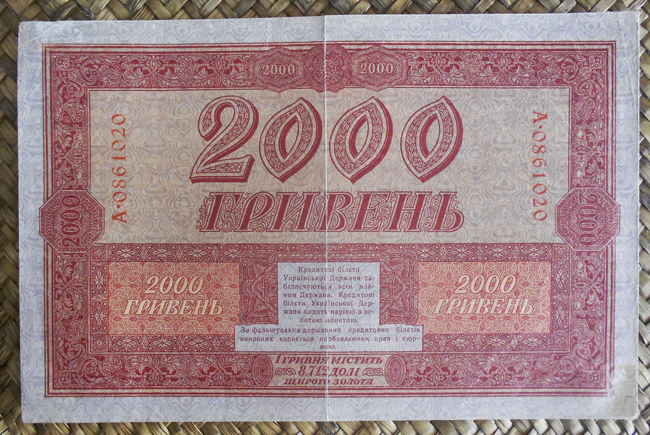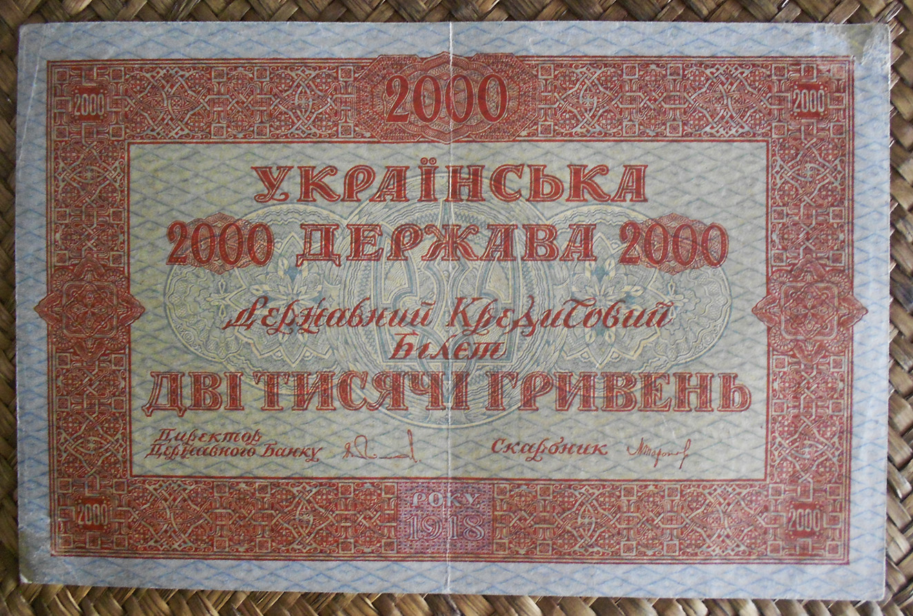 El billete de 2.000 grivnas de Ucrania –Crédito estatal de 1918 nos muestra en su anverso un artístico marco rectangular alrededor de un fondo de trama romboidal con tres rosetas centrales, dos en forma de estrella a derecha e izquierda y una central en forma de corona que acoge el símbolo nacional del tryzub. Los números de serie pasan al reverso, por duplicado, en posición vertical y tipografía roja. Cromaticidad roja para marco y textos y amarillo verdosa para grabados y fondos en anverso; en el reverso mismos tonos con algún añadido grisáceo.