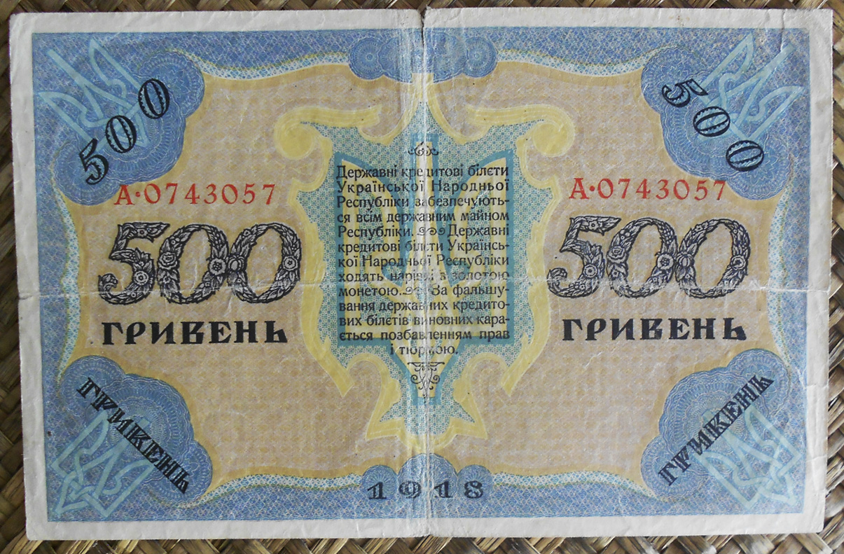 El billete de 500 grivnas de Ucrania –Crédito estatal de 1918 nos muestra al anverso un marco octogonal con la cabeza alegórica de Ucrania, del que parten sectores radiales alternados de guilloches y líneas hacia el exterior completando los 360º. Una orla curvilínea con rosetones alineados remata la caja de márgenes a modo de marco. A ambos lados de la alegoría central dos coronas ovaladas, una de flores y la otra de espigas de trigo, rodean sendos tryzub, tridentes ucranianos. Al reverso dos números de serie horizontales en tipografía roja y el tryzub nuevamente al centro y en las cuatro esquinas. Cromaticidad azul, naranja y marrón en el anverso y azul, amarilla y verde al reverso.