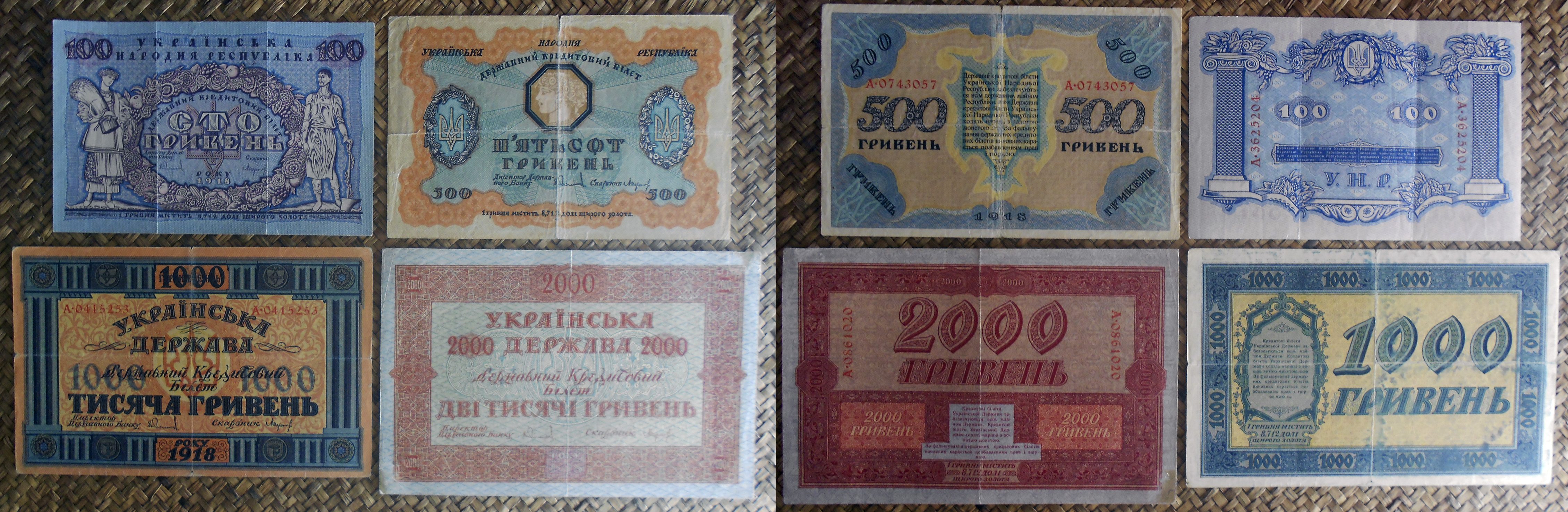 Desde “Miscelánea” nos acercamos a Ucrania, en el centro oriental europeo, para revisar la primera serie de grivnas (hryvnias) de la República Popular Ucraniana (UPR) de 1918. Contemplamos los ejemplares emitidos por el Crédito Estatal de la UPR de 100 grivnas, 500 grivnas, 1.000 grivnas y 2.000 grivnas.