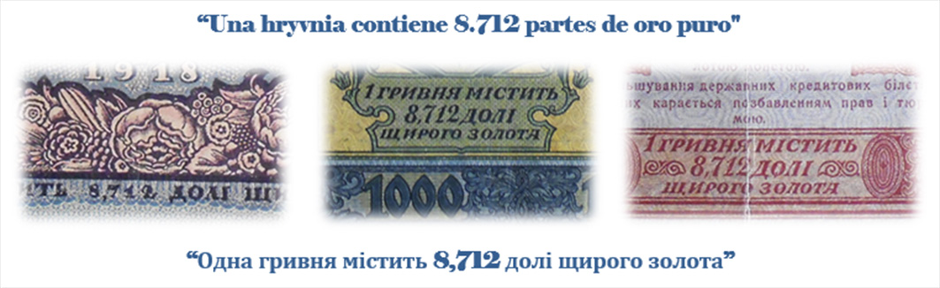 A finales de 1918 se aprobaría la ley de emisión de billetes para la UPR, admitiendo dos tipos de moneda, el karvovanet y la hryvnia. Cada karvovanet representaba 17,424 partes de oro puro y su paridad con la hryvnia era 1 karvovanet = 2 hryvnias, por lo que una hryvnia representaba 8,712 partes de oro puro. Este dato de garantía del papel de Crédito Estatal con el patrón de oro aparecerá reflejado en los anversos o reversos de toda la serie.