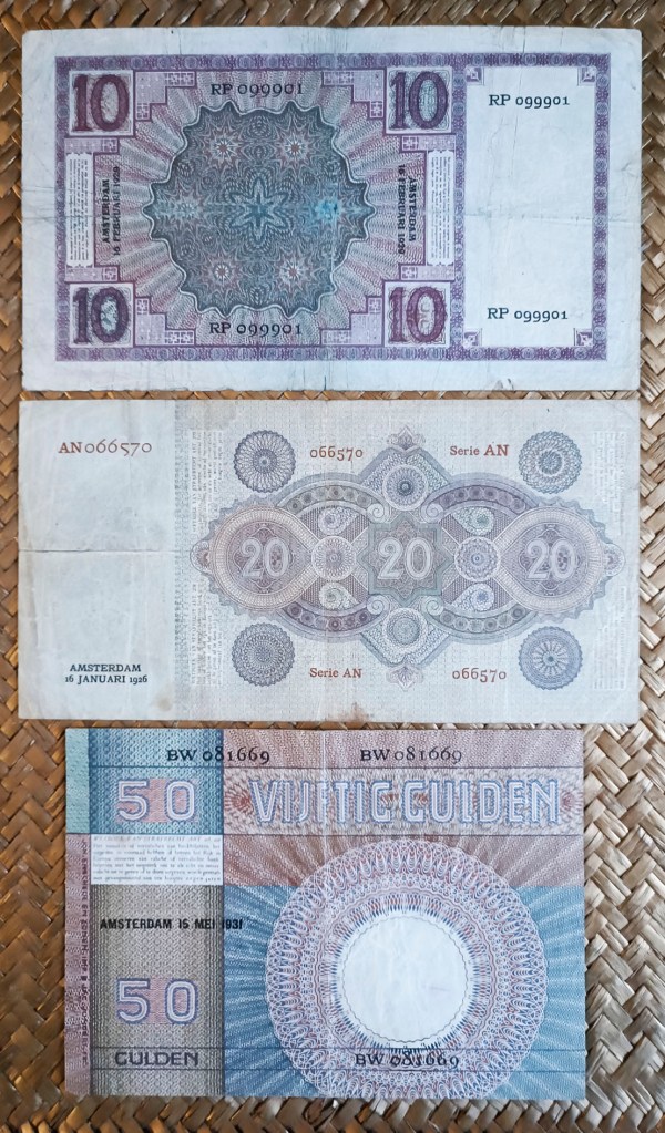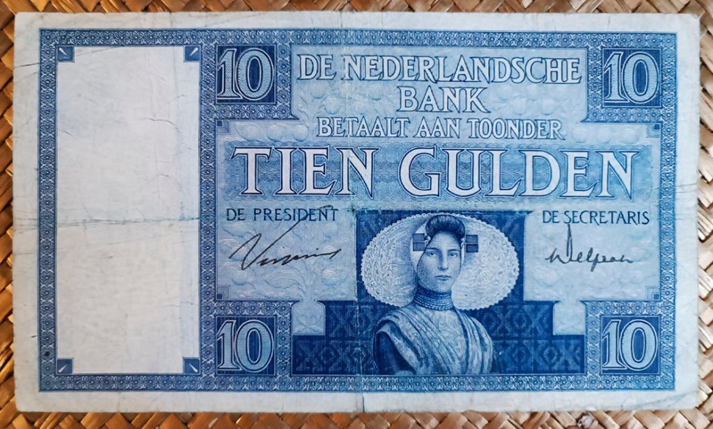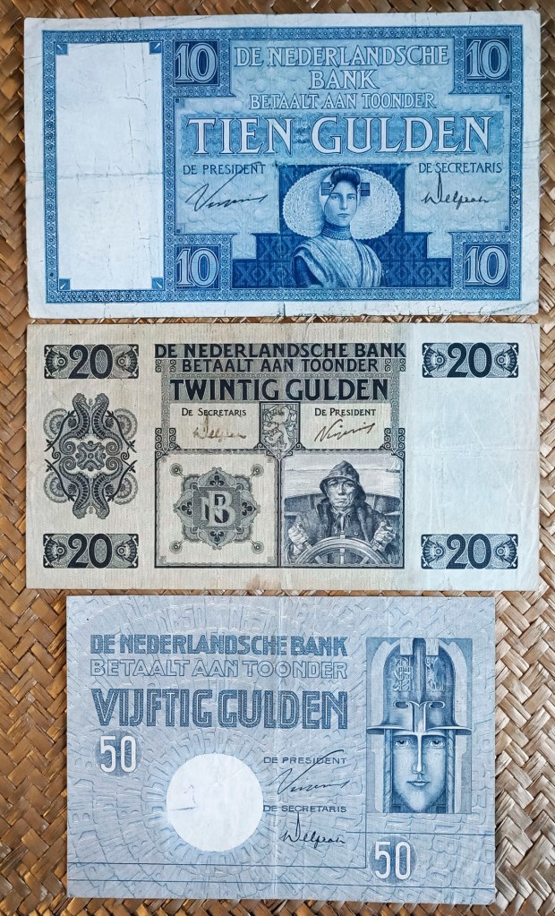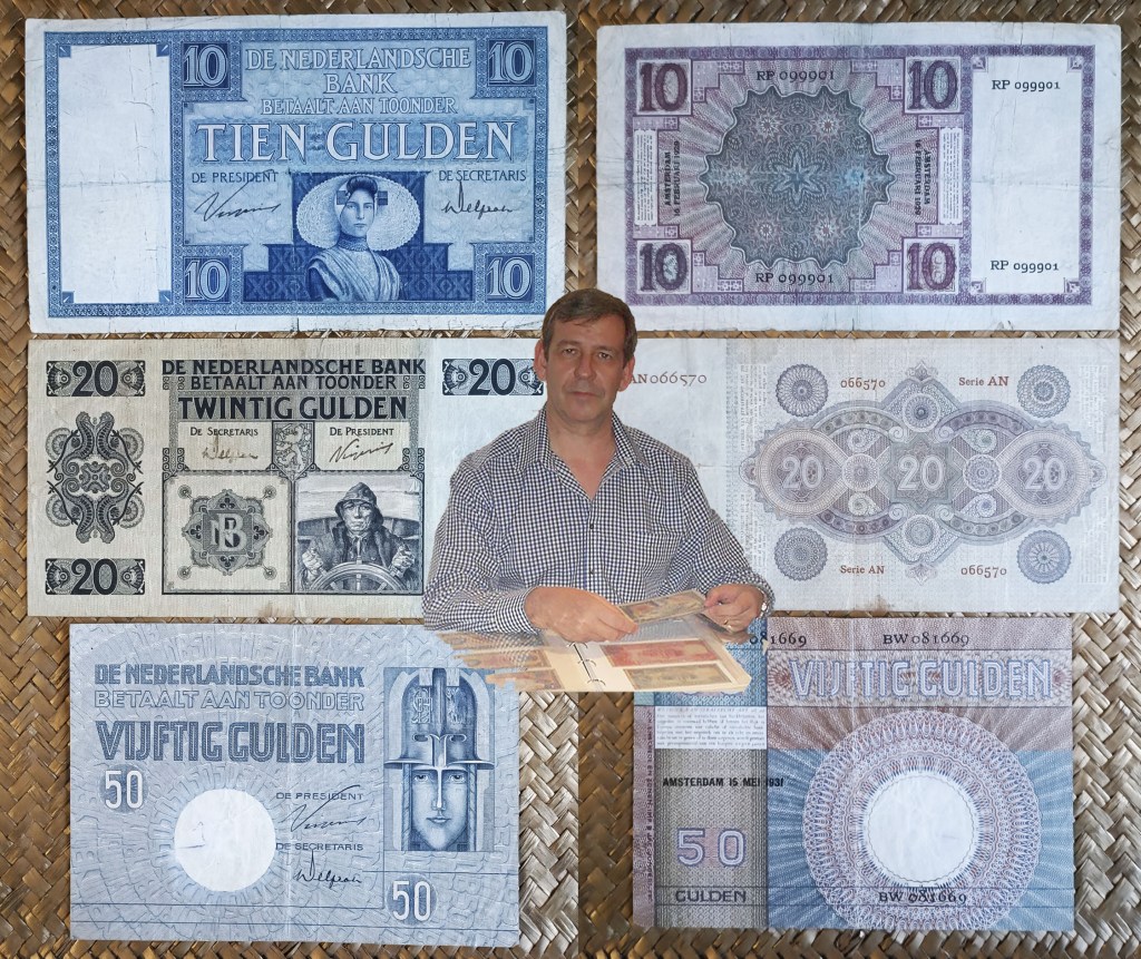 Vamos a revisar una terna de billetes emitidos para Holanda en la década de los años ’20 del pasado siglo. Un tiempo difícil para Europa, con una recuperación postbélica todavía reciente que culminaría con la Gran Depresión de 1929, iniciada con la caída de la Bolsa de Nueva York, que sumiría al comercio internacional, al desempleo y al poder financiero mundial en una crisis sin precedentes. Contemplamos los billetes de Holanda de 10 florines de 1929, 20 florines de 1926 y 50 florines de 1931, emitidos por el De Nederlandsche Bank de Amsterdam e impresos por la empresa Johan Enschedé en Zonen, de Haarlem. La serie se completa con los valores de 25 y 500 florines (no mostrados). Se desmonetizaron en 1945.