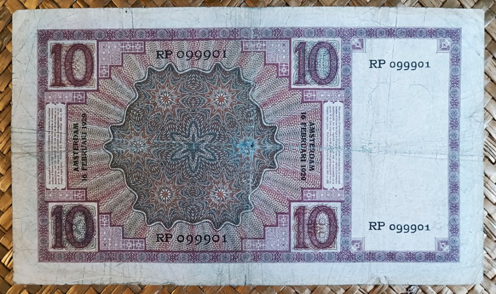 El billete de 10 florines de Holanda de 1929 está presidido por la viñeta de una joven con vestimenta y sombrero típico de la provincia de Zelanda, al sur del país. El retrato es de una trabajadora de la sucursal del Banco DNB en la capital de dicha provincia, Middelburg, ataviada con el traje tradicional. Cromaticidad predominante azulada en su anverso y con tonos violetas, verdes y marrones al reverso. La zona de reserva para la marca de agua es rectangular, situada en el tercio izquierdo del campo del billete. Los dos tercios restantes quedan enmarcados con el valor en nº en sus cuatro esquinas y un fondo de hojas, tallos y frutos sobre el que se dibujan las leyendas y la viñeta principal.