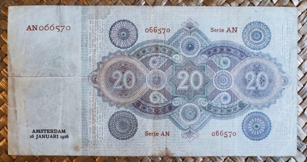 El billete de 20 florines de Holanda de 1926 nos ofrece como viñeta principal un primer plano de un marinero al timón en plena navegación, con algún velero a lo lejos. A la izquierda de su dibujo el logo del banco con las letras superpuestas NB en una roseta muy barroca. Al centro del anverso el escudo de armas de Países Bajos (un león rampante con una espada y un manojo de flechas en sus garras). Cuatro rosetones tipo cartela con el valor del billete en las respectivas esquinas y una artística figura con cuatro caballitos de mar en simetría radial completan este bello anverso. Cromaticidad con fondo amarillo verdoso, leyendas en negro y grabados en tonos azules.