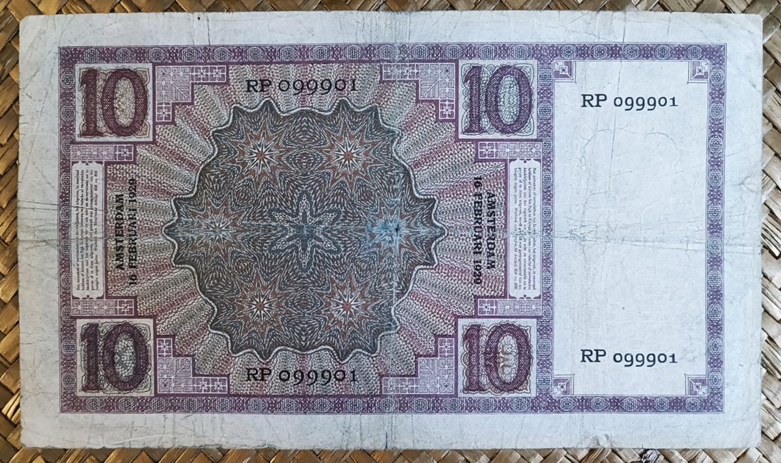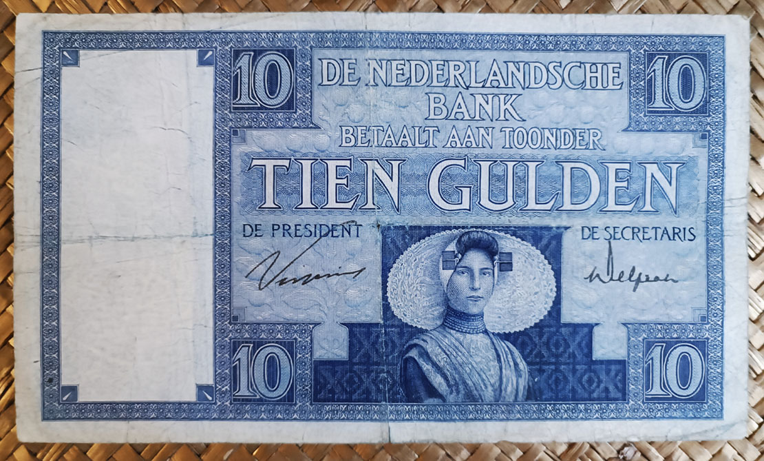 El billete de 10 florines de Holanda de 1929 está presidido por la viñeta de una joven con vestimenta y sombrero típico de la provincia de Zelanda, al sur del país. El retrato es de una trabajadora de la sucursal del Banco DNB en la capital de dicha provincia, Middelburg, ataviada con el traje tradicional. Cromaticidad predominante azulada en su anverso y con tonos violetas, verdes y marrones al reverso. La zona de reserva para la marca de agua es rectangular, situada en el tercio izquierdo del campo del billete. Los dos tercios restantes quedan enmarcados con el valor en nº en sus cuatro esquinas y un fondo de hojas, tallos y frutos sobre el que se dibujan las leyendas y la viñeta principal.