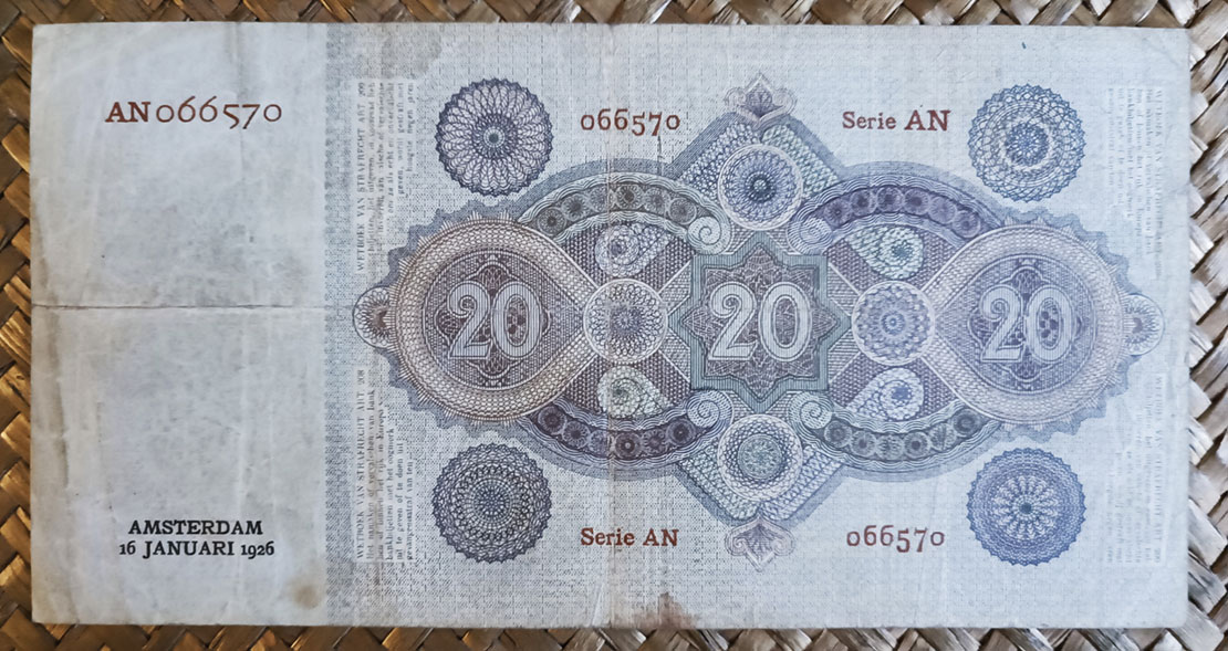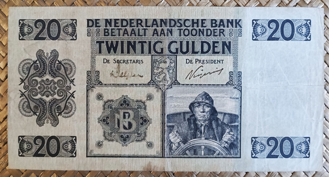 El billete de 20 florines de Holanda de 1926 nos ofrece como viñeta principal un primer plano de un marinero al timón en plena navegación, con algún velero a lo lejos. A la izquierda de su dibujo el logo del banco con las letras superpuestas NB en una roseta muy barroca. Al centro del anverso el escudo de armas de Países Bajos (un león rampante con una espada y un manojo de flechas en sus garras). Cuatro rosetones tipo cartela con el valor del billete en las respectivas esquinas y una artística figura con cuatro caballitos de mar en simetría radial completan este bello anverso. Cromaticidad con fondo amarillo verdoso, leyendas en negro y grabados en tonos azules.