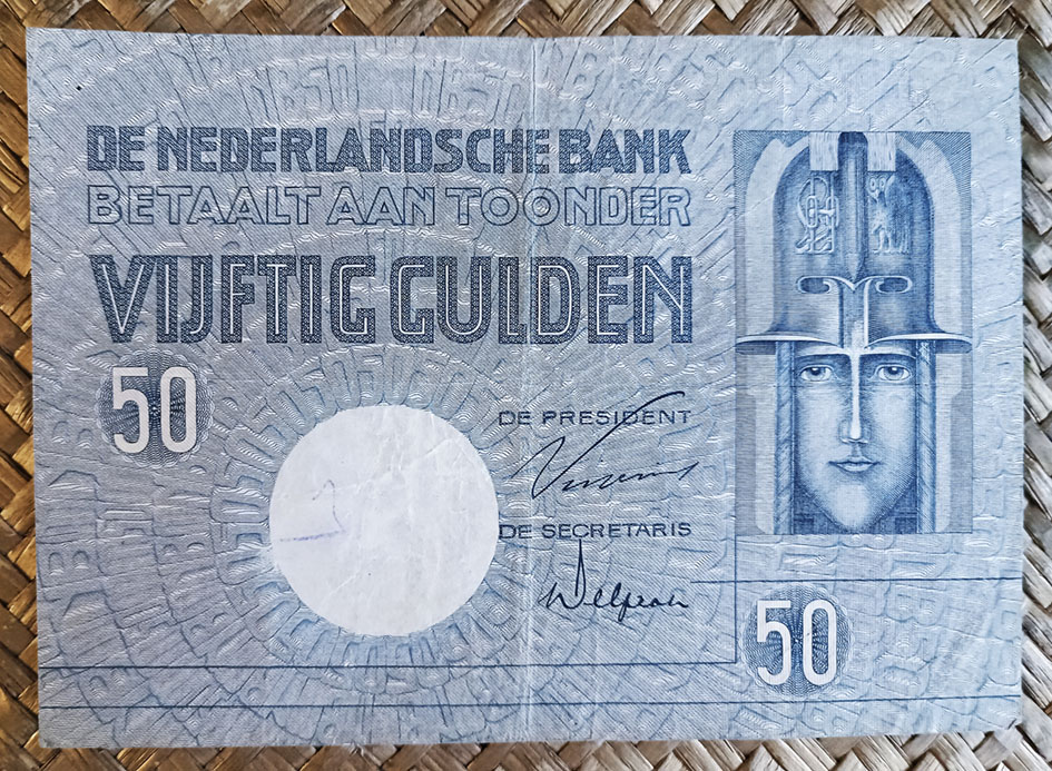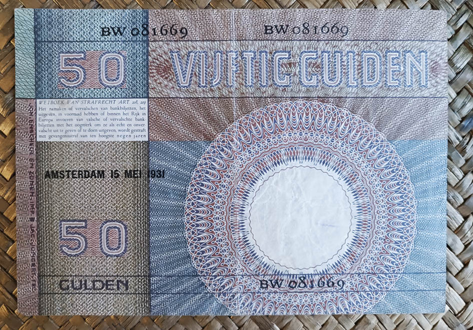 El billete de 50 florines de Holanda de 1931 nos muestra a la derecha del anverso la cabeza de la diosa romana Minerva (la Atenea griega) con casco y dos de sus atributos, la lechuza y una especie de brida de carruajes. Minerva era la deidad de la guerra, a la vez que patrona de los artesanos. A la izquierda, y sobre el área circular de reserva para la marca de agua, se superponen bandas circulares concéntricas con el valor del ejemplar y las iniciales del banco NB embutidas a modo de anillos esculpidos superpuestos. Esta composición ocupará todo el campo libre del billete y sobre él irán las leyendas en letras de diferentes tipos y tramas y dos discos de guilloches con el valor numeral. Cromaticidad gris azulada.