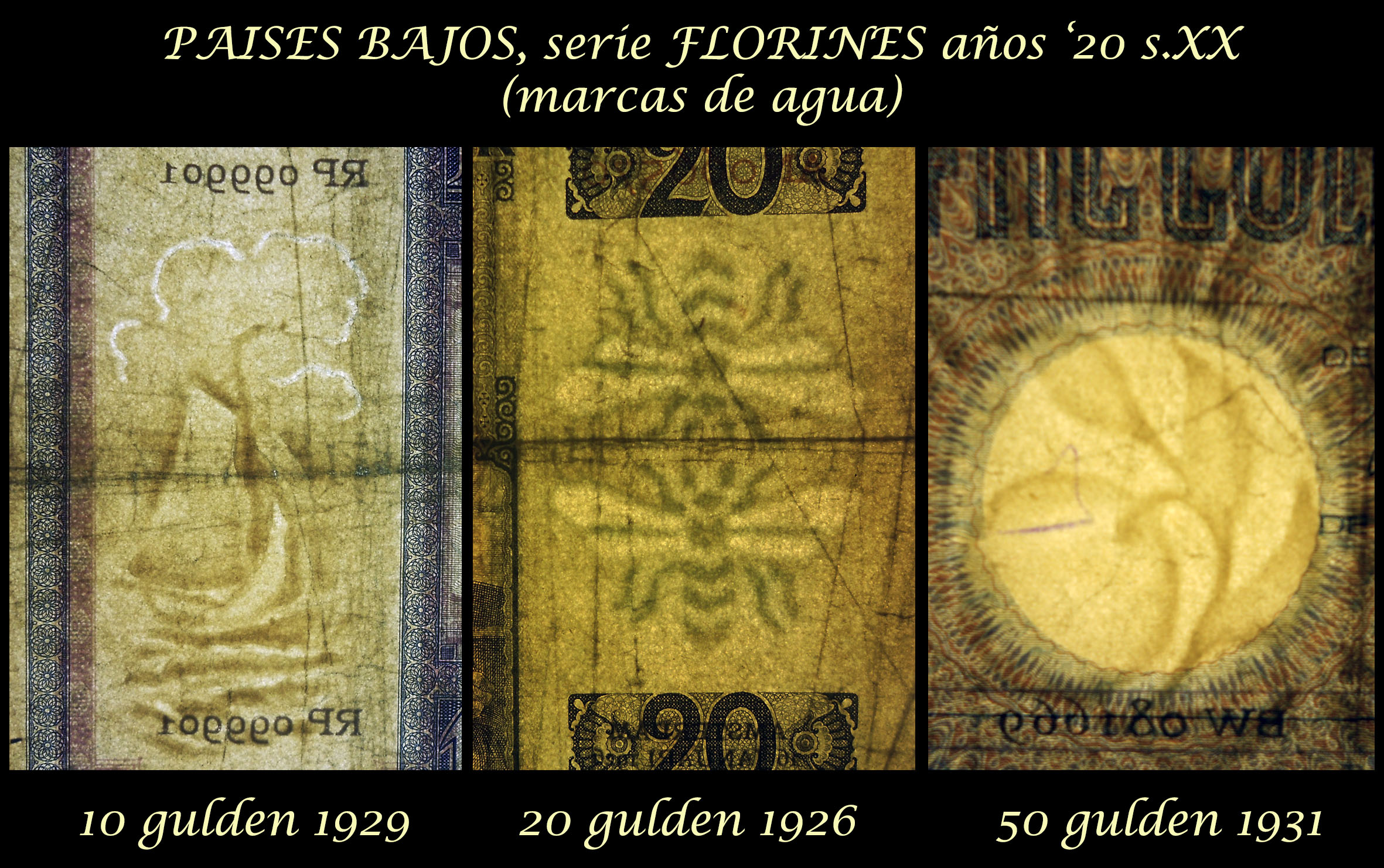 En cuanto a las marcas de agua, veremos desde un velero en el mar para el ejemplar de 10 florines, dos avispas simétricas en el billete de 20 florines o un conjunto de hojas palmeadas en el ejemplar de 50 florines.