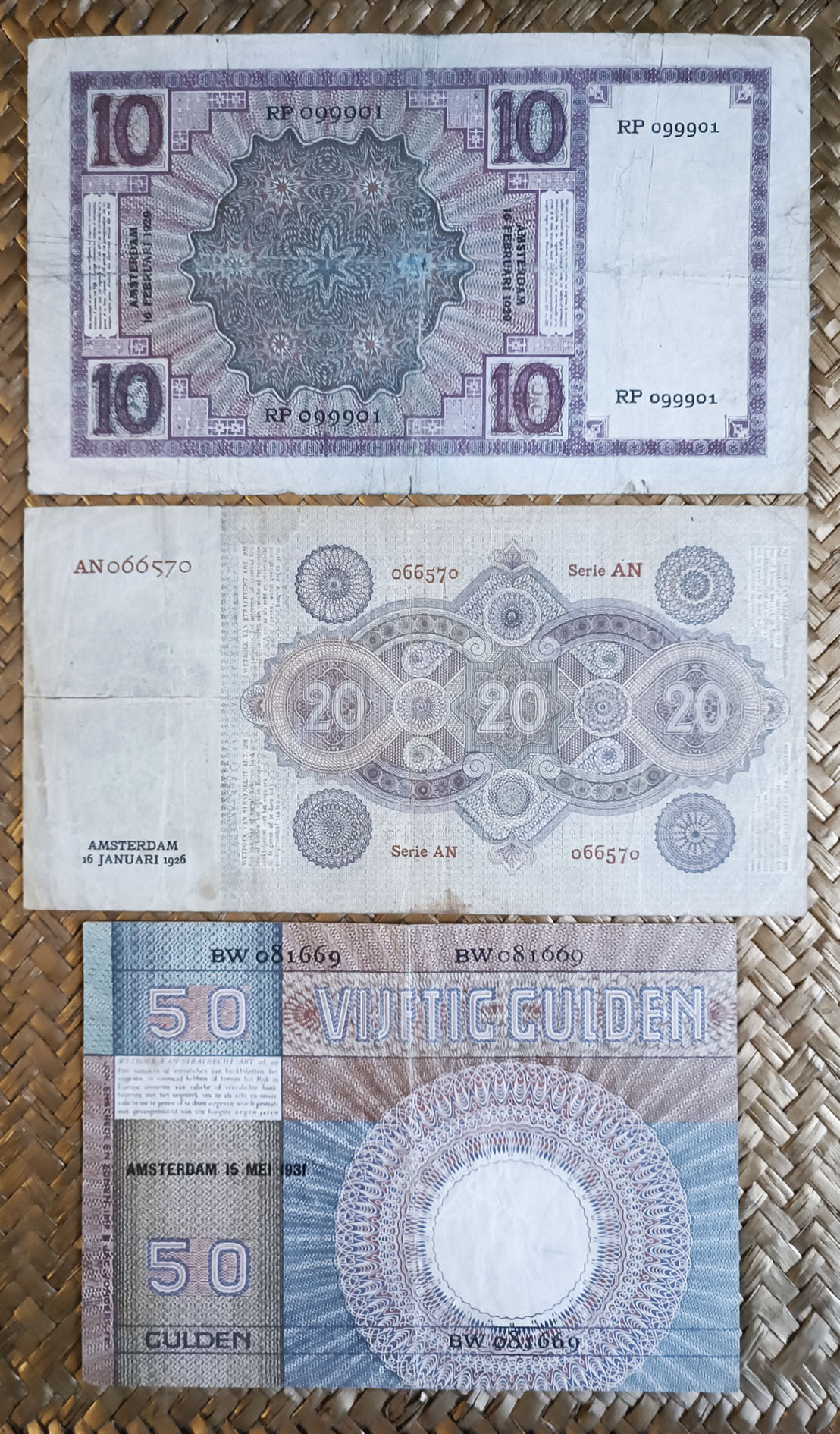 Vamos a revisar una terna de billetes emitidos para Holanda en la década de los años ’20 del pasado siglo. Un tiempo difícil para Europa, con una recuperación postbélica todavía reciente que culminaría con la Gran Depresión de 1929, iniciada con la caída de la Bolsa de Nueva York, que sumiría al comercio internacional, al desempleo y al poder financiero mundial en una crisis sin precedentes. Contemplamos los billetes de Holanda de 10 florines de 1929, 20 florines de 1926 y 50 florines de 1931, emitidos por el De Nederlandsche Bank de Amsterdam e impresos por la empresa Johan Enschedé en Zonen, de Haarlem. La serie se completa con los valores de 25 y 500 florines (no mostrados). Se desmonetizaron en 1945.