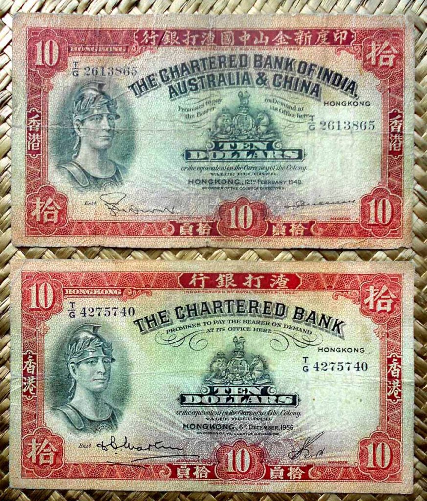 Vamos a revisar los ejemplares de Hong Kong de 50, 100 y 500 dólares de 1983 y la emisión de 10, 50 dólares de 1985 y 20 dólares de 1990, que estrenarán un formato de papel de dimensiones más reducidas. Diseñados por el artista Henry Steiner, diseñador austriaco afincado en Hong Kong e impresos por la Bradbury, Wilkinson & Co. de Londres (los ejemplares de 1983) y por Thomas de la Rue & Co. Lmtd. (la serie de 1985). Con textos en chino e inglés, llevan numeración de serie en tipografía negra y por duplicado solo en anversos. De cromaticidad predominante monocromo por valores, los ejemplares de 1983 llevan las firmas del Manager y del General Manager. Los ejemplares de la serie de 1985 ya solo incluyen una firma para su validación, la del General Manager.