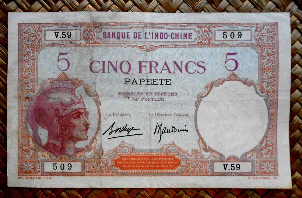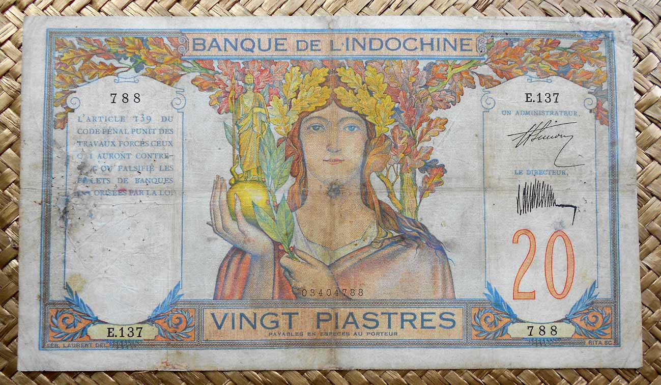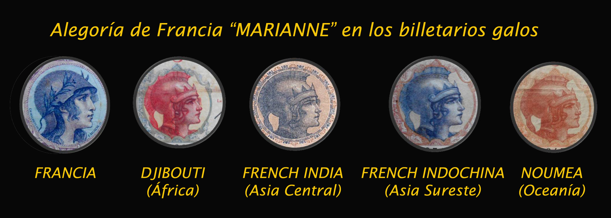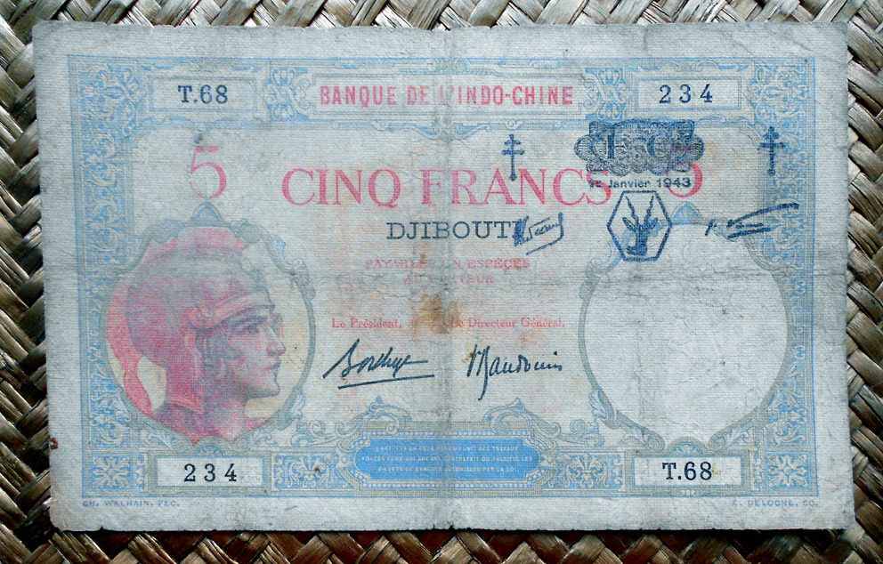 Revisamos los billetes de 20 francos de Djibouti de 1928-38 en coloración lila amarronada y en coloración azulada, el ejemplar de 20 francos de Nueva Caledonia de 1929 y el billete de 5 piastras de Indochina de 1926. Todos ellos nos ofrecen en su anverso la alegoría de una joven dama coronada con una diadema de espigas, hojas y frutos, en clara alusión a la mitológica Ceres (o Deméter), diosa de la Agricultura, la Cosecha y la Fecundidad. Todo ello en un artístico marco con hojas y palmas, Bajo un diseño de los artistas franceses Clement Serveau / Emile Deloche (anverso) y Rita Dreyfuss / Roche (reverso), con textos en francés y números de serie en tipografía negra, combinan coloraciones predominantes según el destino de sus emisiones.