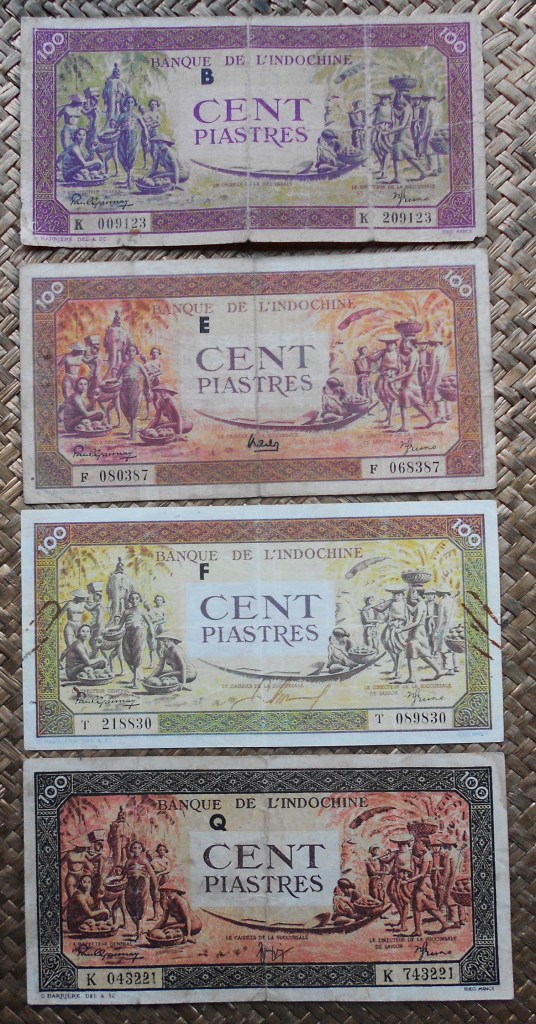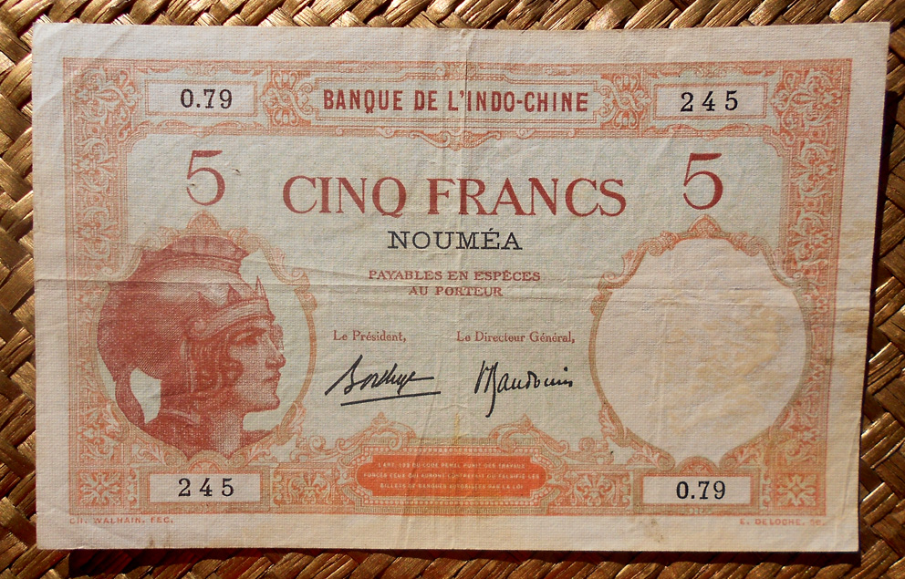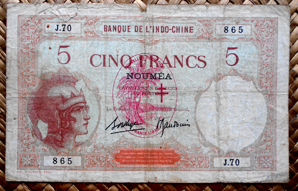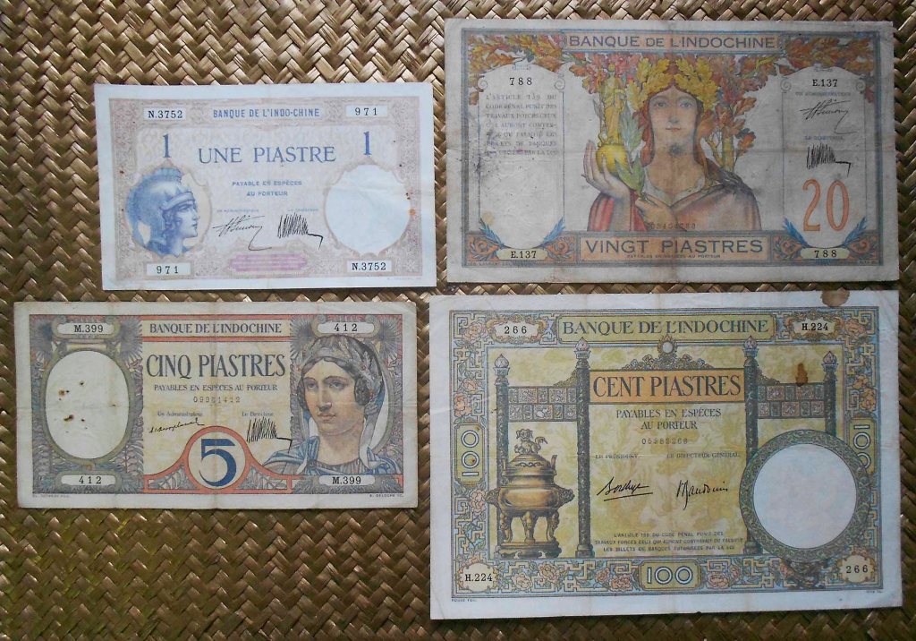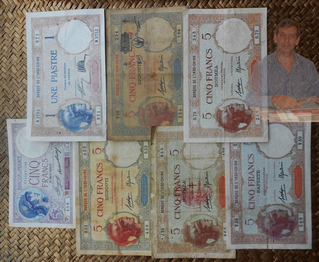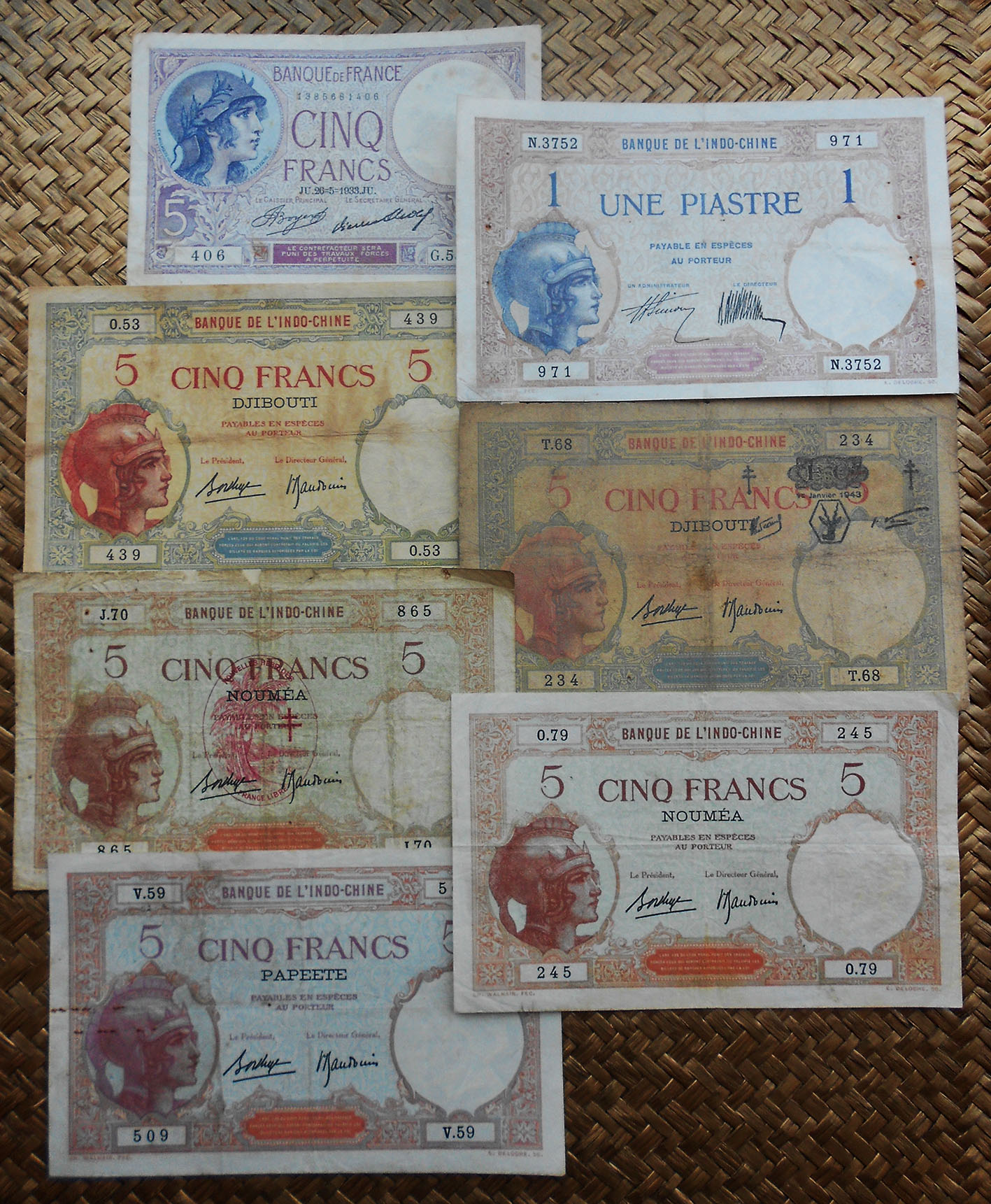 Contemplaremos francos emitidos para Djibouti (o Somalilandia francesa), piastras emitidas para Indochina (en la actualidad el territorio ocupado por Camboya, Vietnam y Laos) y francos emitidos para Nueva Caledonia. Todos comparten un diseño común; de hecho sus viñetas y composiciones solo cambian coloraciones, textos y moneda, siendo todos los ejemplares revisados emisiones que circularían en los años ’30 del pasado siglo.