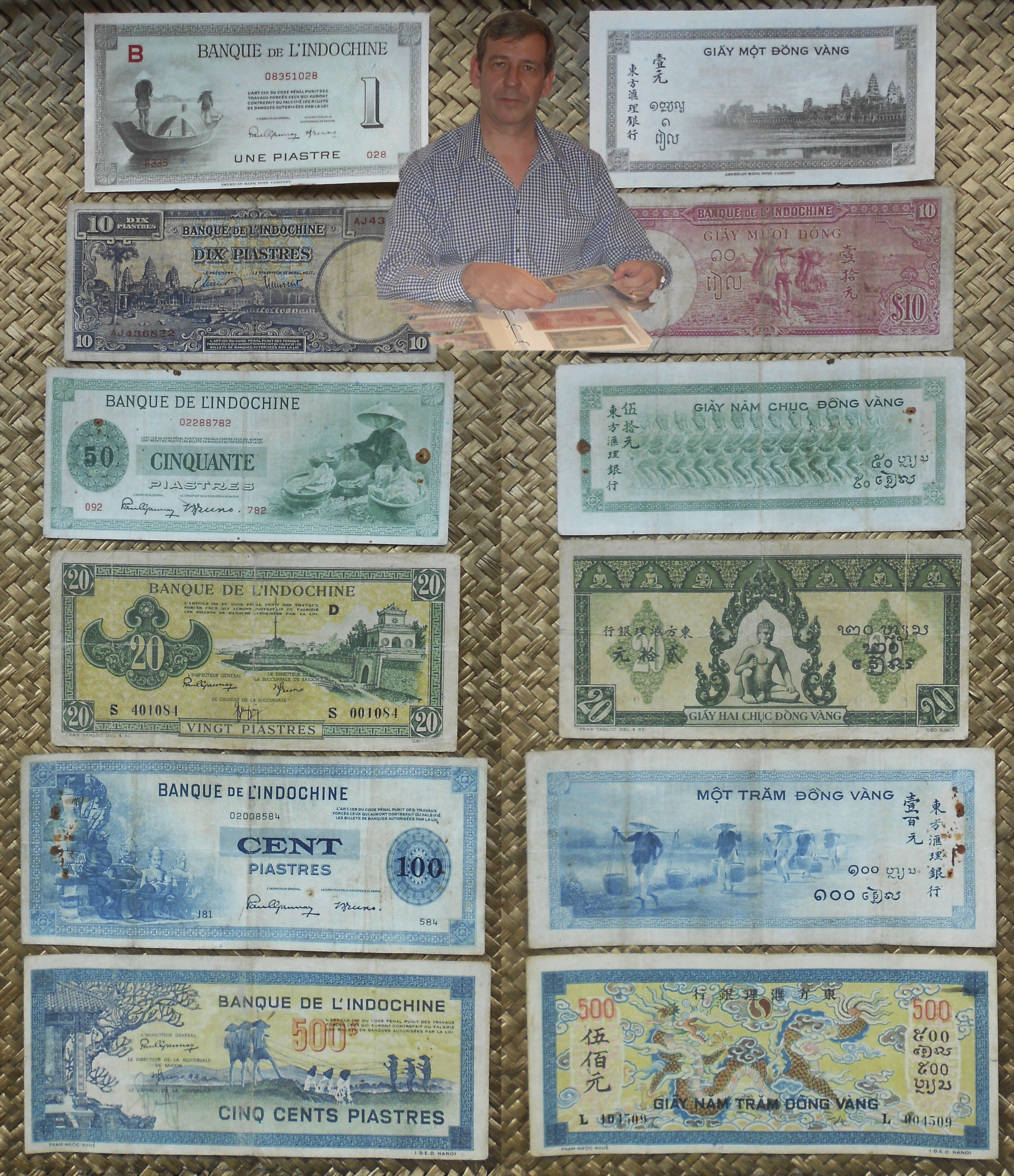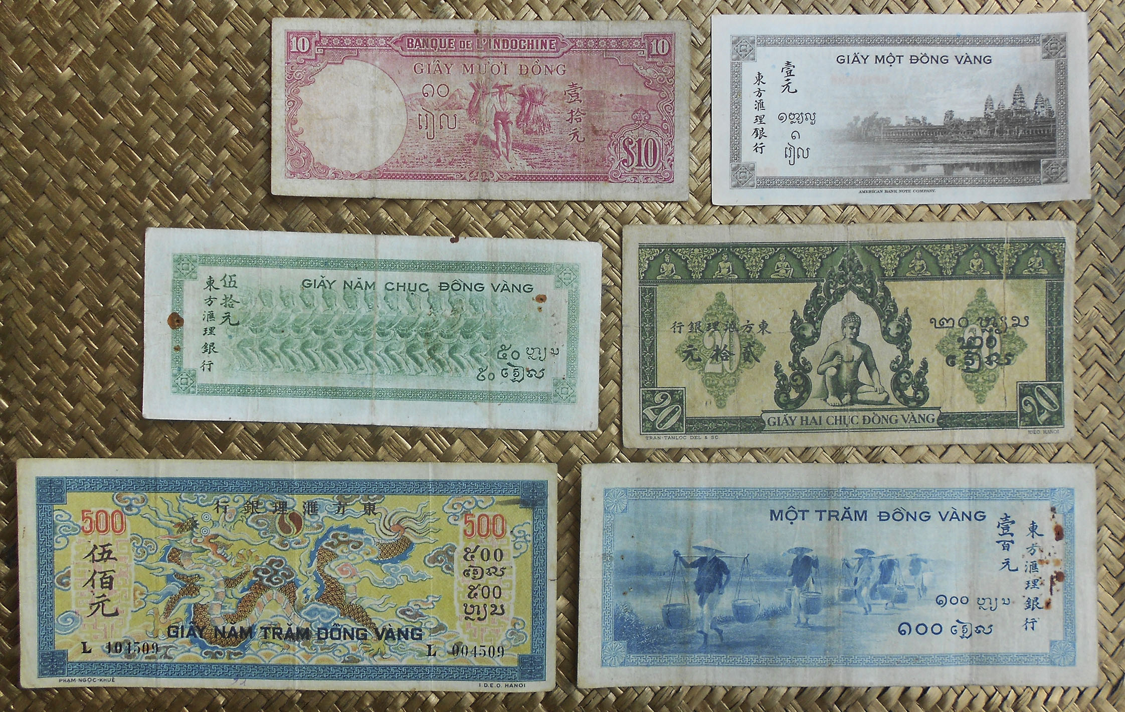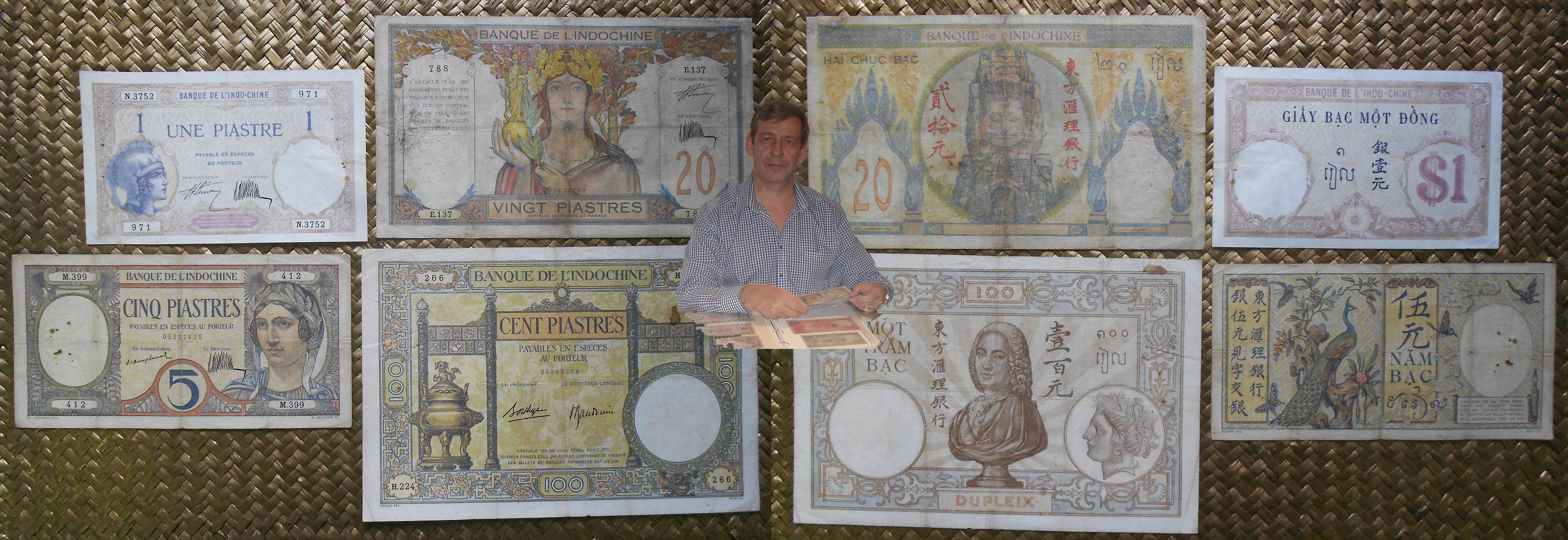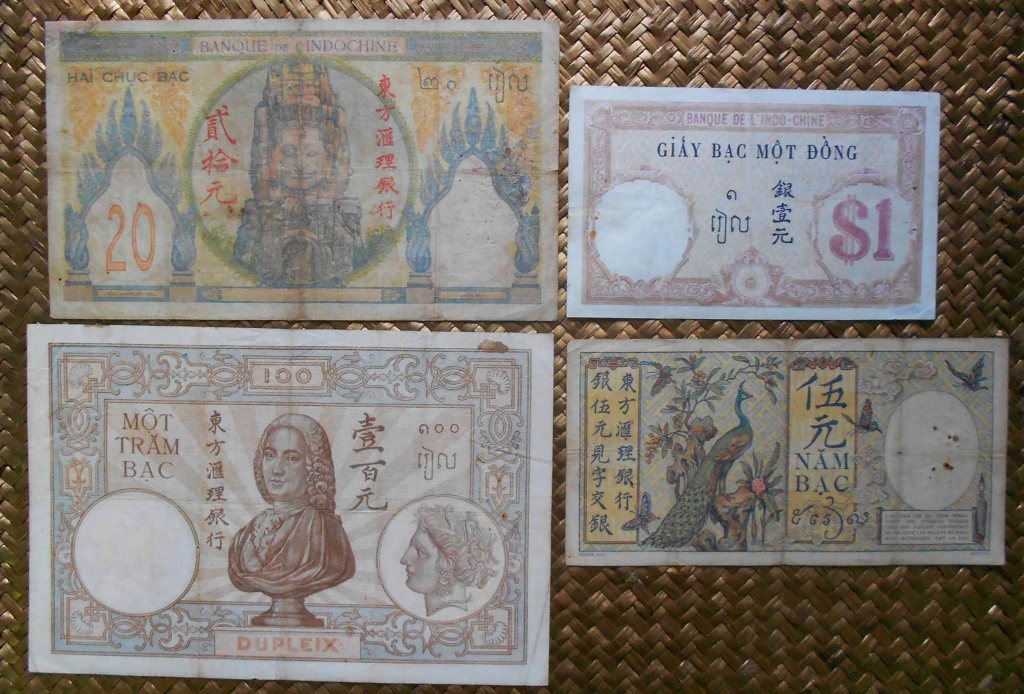 Contemplaremos francos emitidos para Djibouti (o Somalilandia francesa), piastras emitidas para Indochina (en la actualidad el territorio ocupado por Camboya, Vietnam y Laos) y francos emitidos para Nueva Caledonia. Todos comparten un diseño común; de hecho sus viñetas y composiciones solo cambian coloraciones, textos y moneda, siendo todos los ejemplares revisados emisiones que circularían en los años ’30 del pasado siglo.