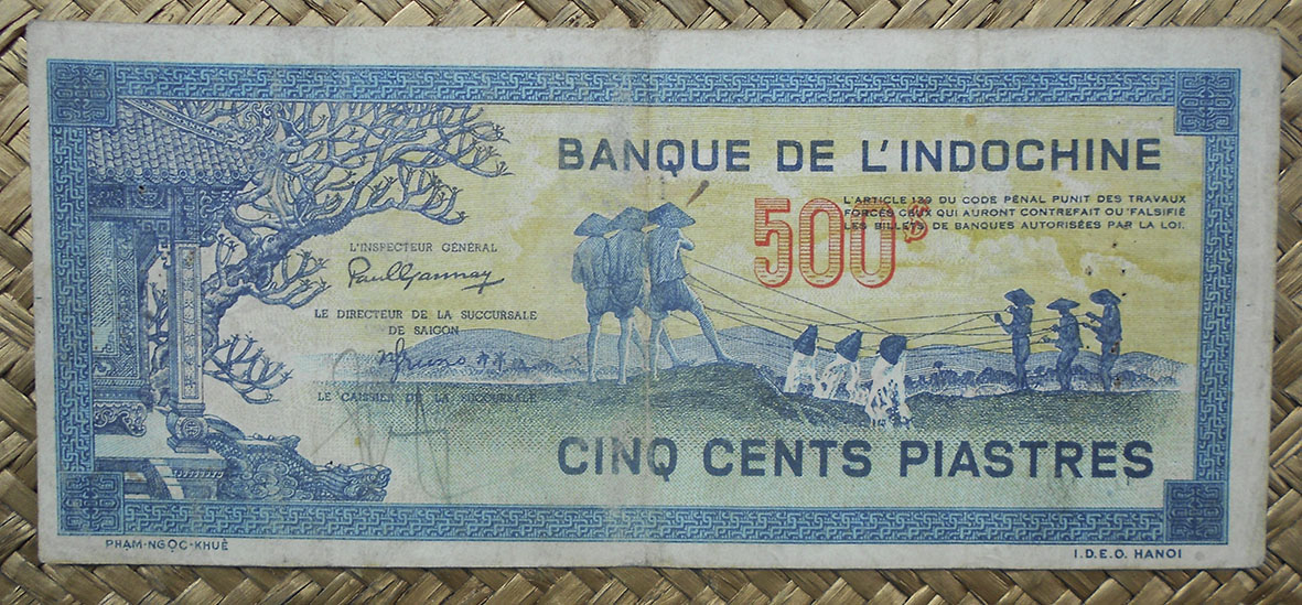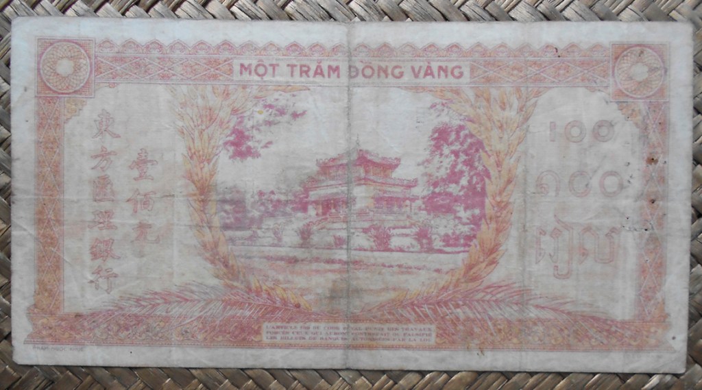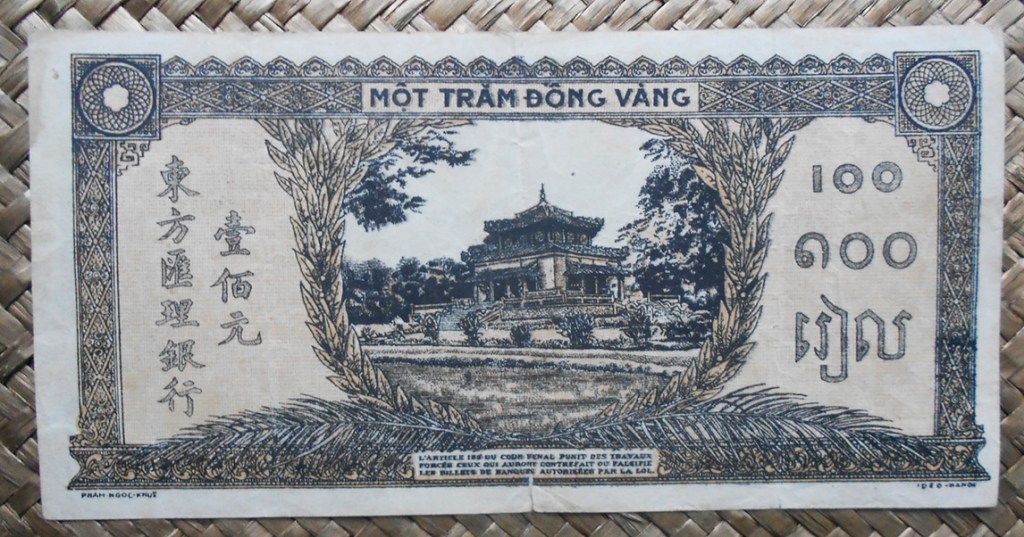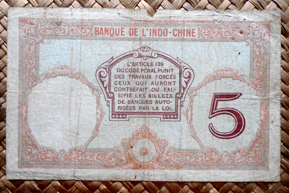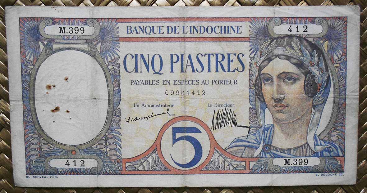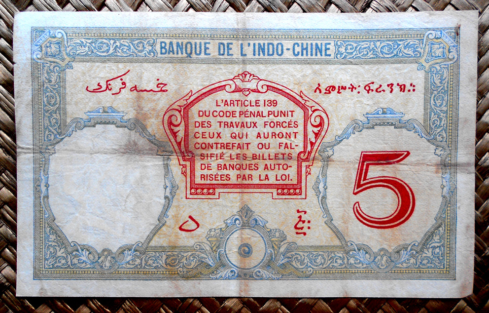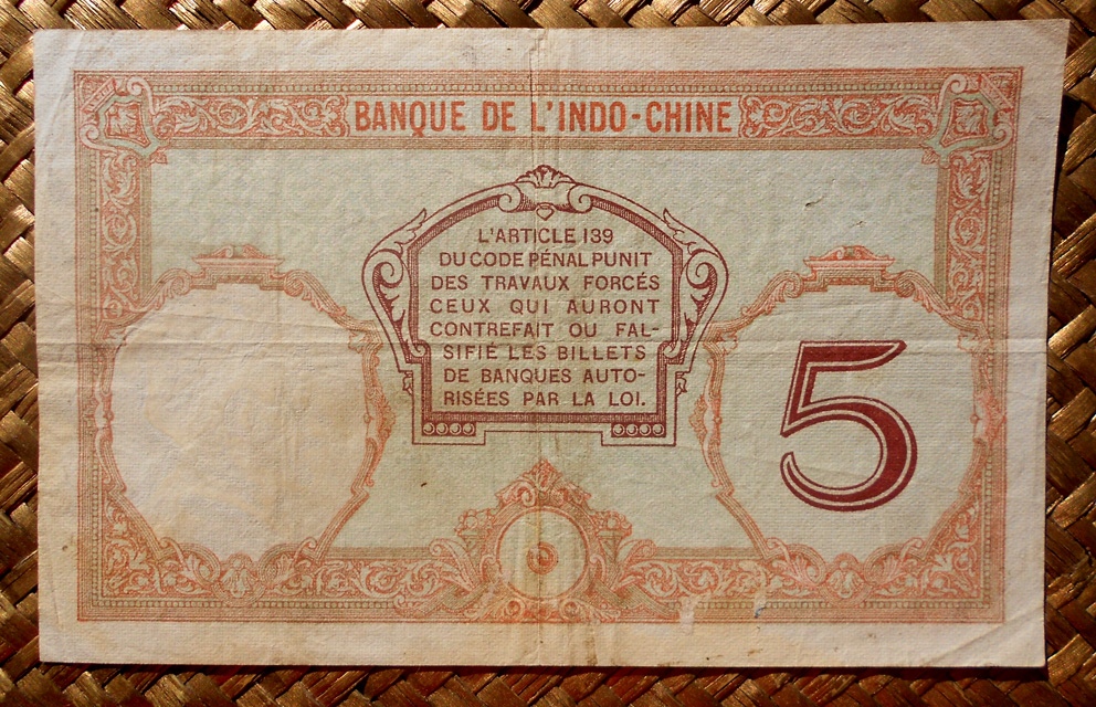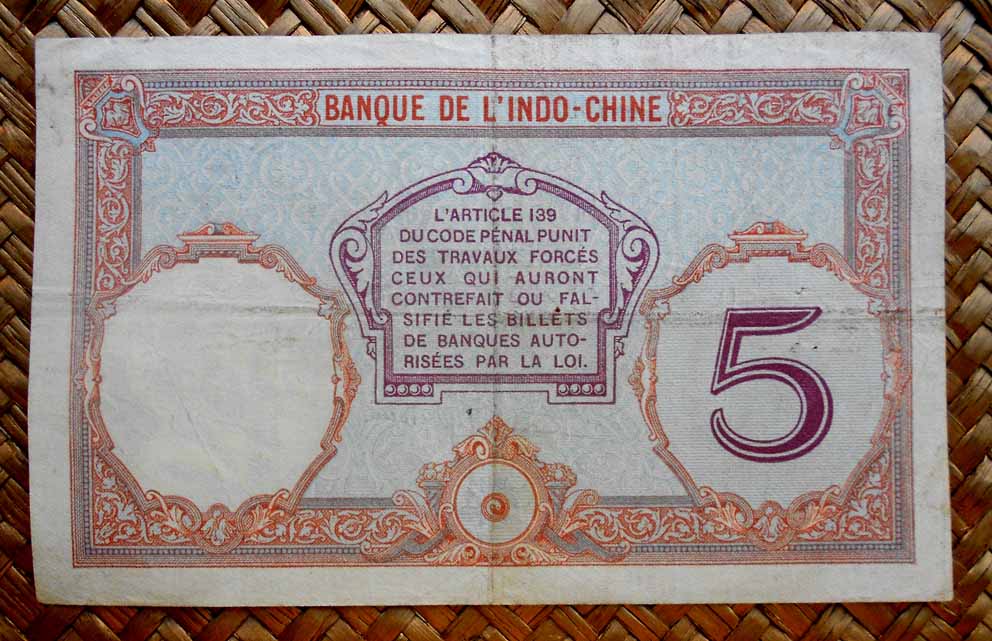 El billete de 5 piastras de Indochina de 1926 (pick.49a) ofrece un anverso de coloración predominante azul oscura con bandas rojas. Texto, numeración de valor y pies de firma en azul. Lleva las firmas de Albert de Monplanet como Un Administrateur y de René Thion de la Chaume como Le Dirécteur. Para el reverso nos ofrece el texto en chino, japonés, vietnamita, jemer y laosiano.