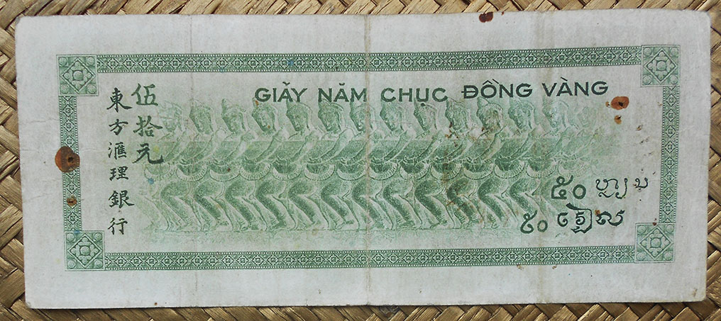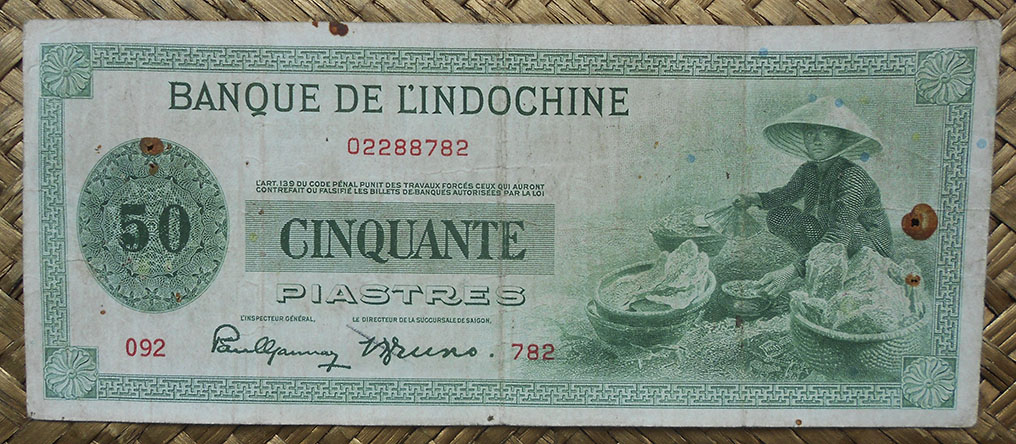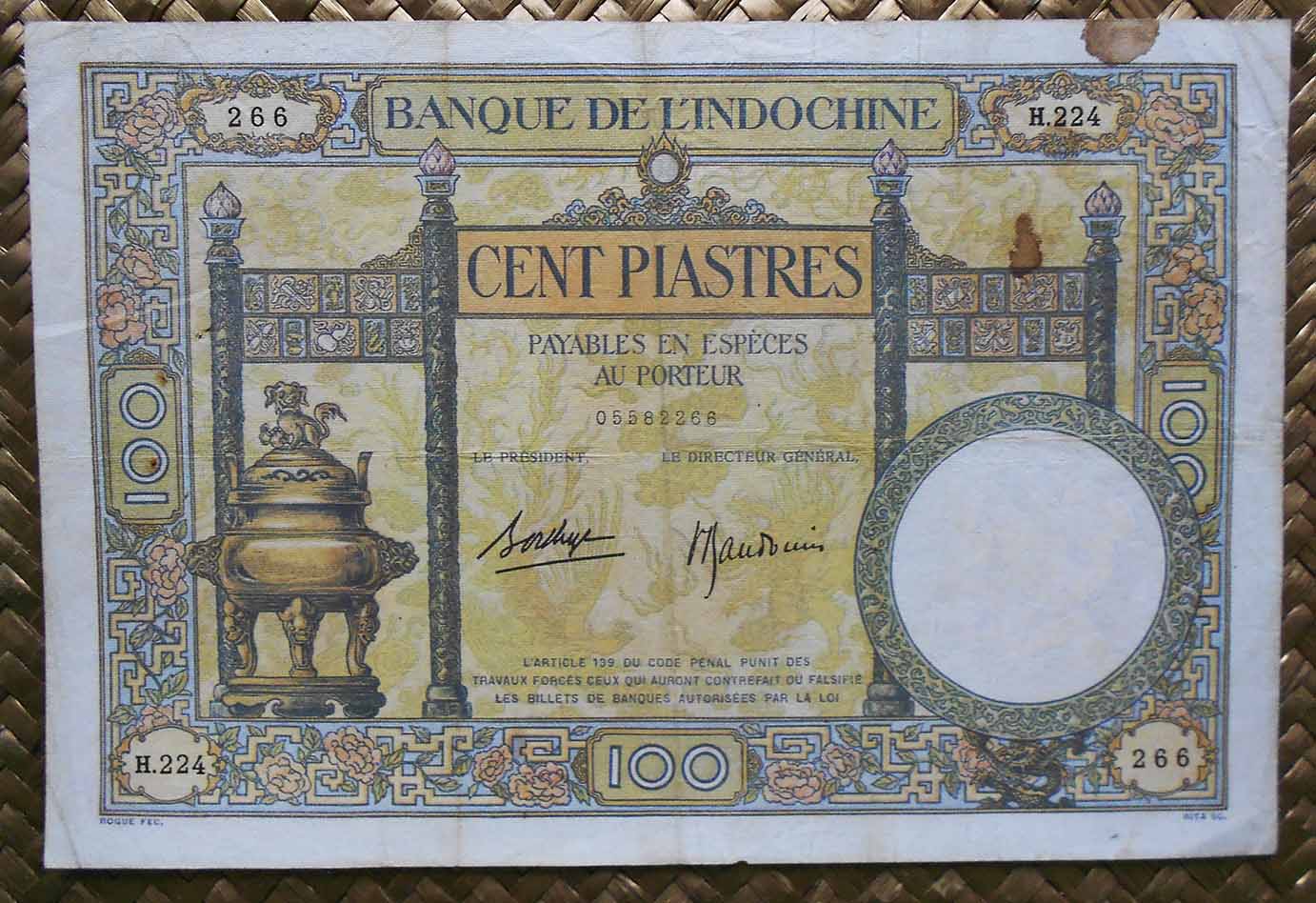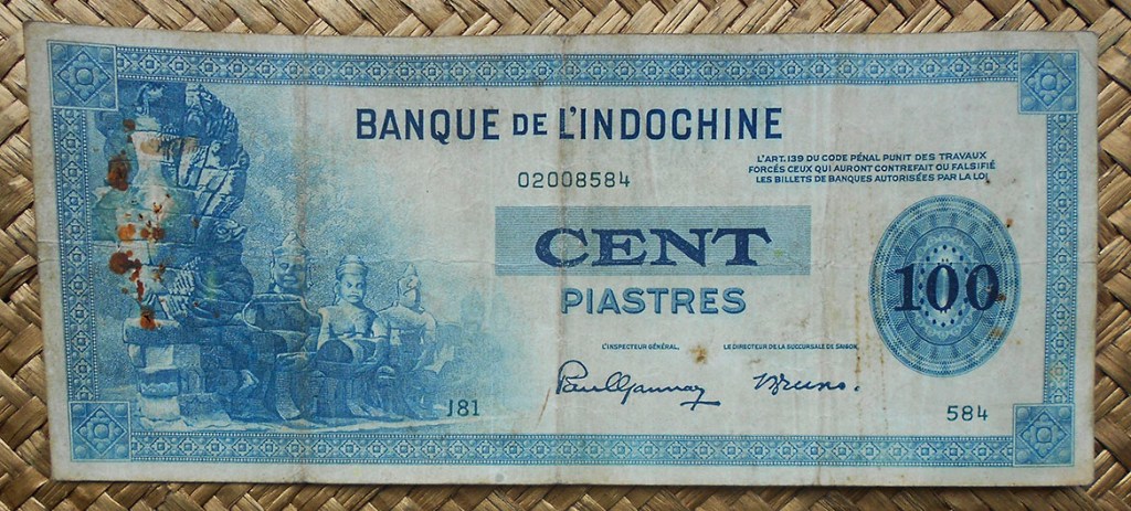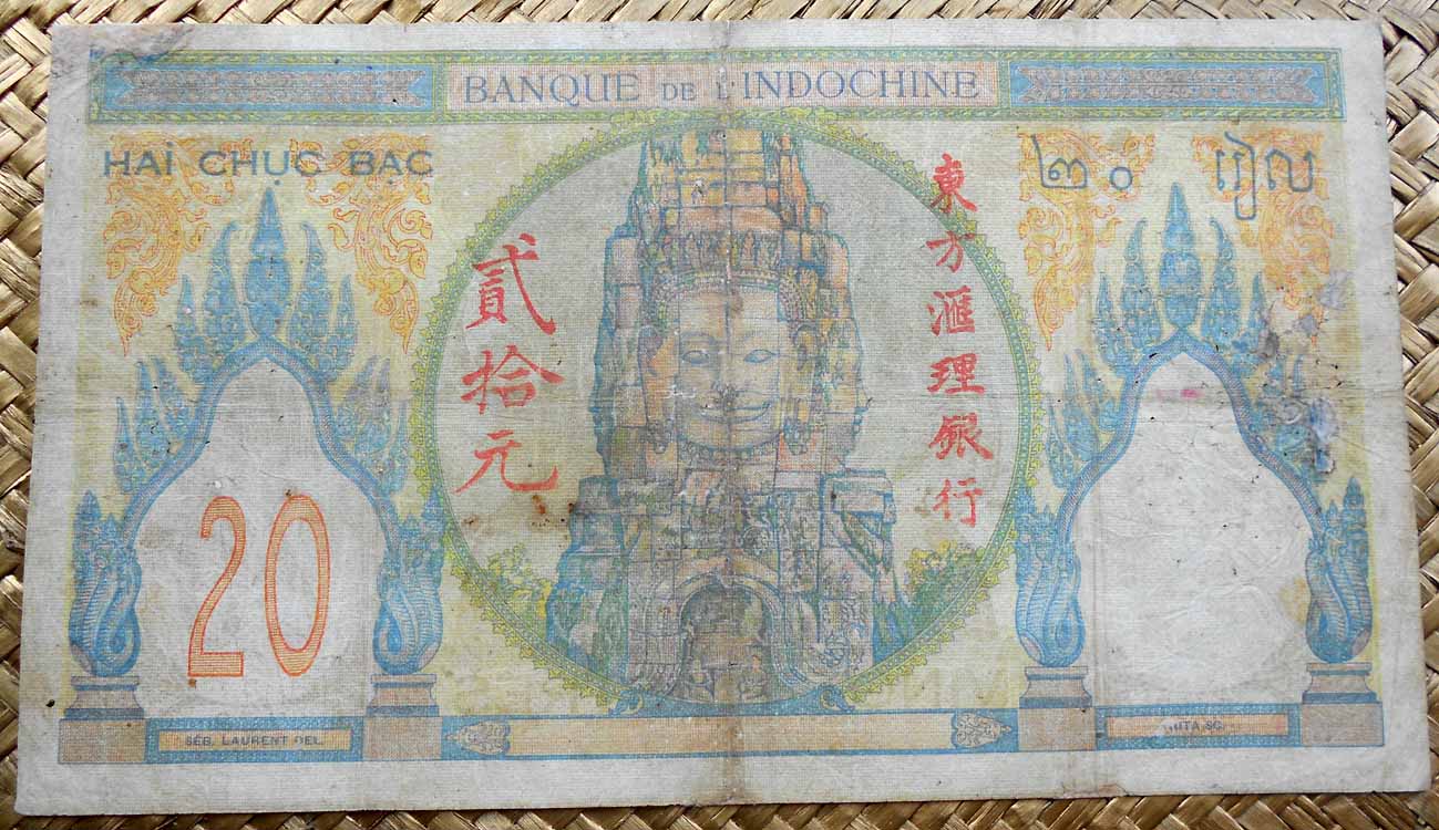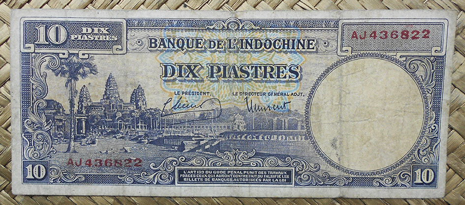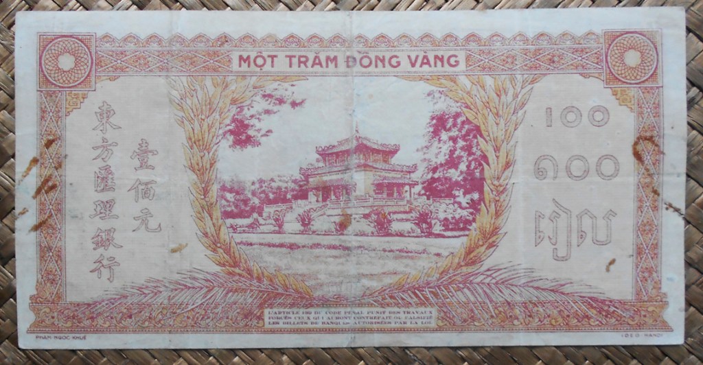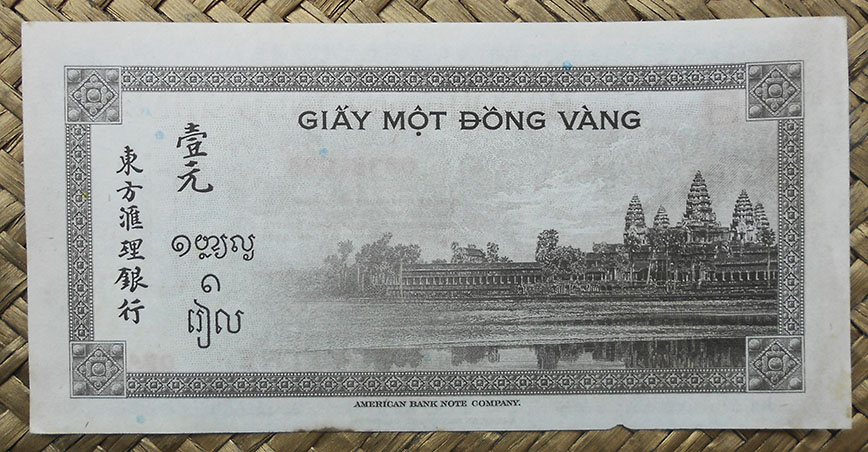 El billete de 5 piastras de Indochina de 1926 (pick.49a) ofrece un anverso de coloración predominante azul oscura con bandas rojas. Texto, numeración de valor y pies de firma en azul. Lleva las firmas de Albert de Monplanet como Un Administrateur y de René Thion de la Chaume como Le Dirécteur. Para el reverso nos ofrece el texto en chino, japonés, vietnamita, jemer y laosiano.