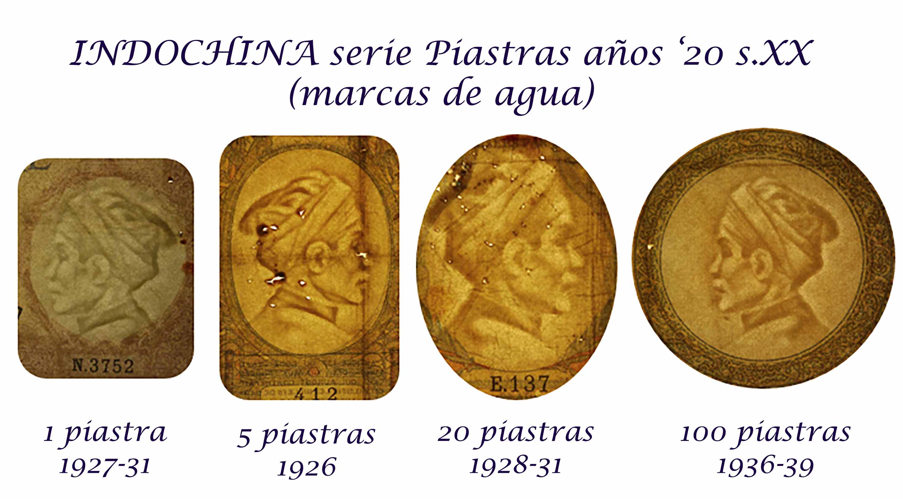 Las marcas de agua, idénticas para los cuatro ejemplares mostrados, representan la cabeza de un indígena indochino ladeada hacia el centro del billete.