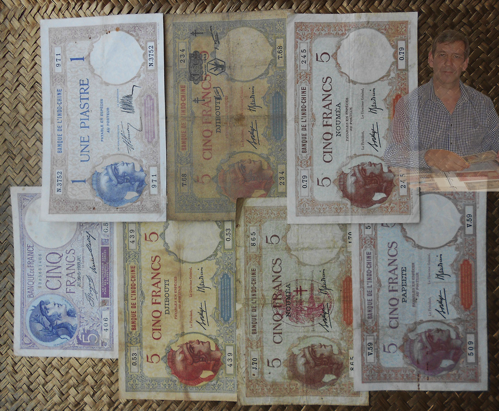Contemplaremos francos emitidos para Djibouti (o Somalilandia francesa), piastras emitidas para Indochina (en la actualidad el territorio ocupado por Camboya, Vietnam y Laos) y francos emitidos para Nueva Caledonia. Todos comparten un diseño común; de hecho sus viñetas y composiciones solo cambian coloraciones, textos y moneda, siendo todos los ejemplares revisados emisiones que circularían en los años ’30 del pasado siglo.