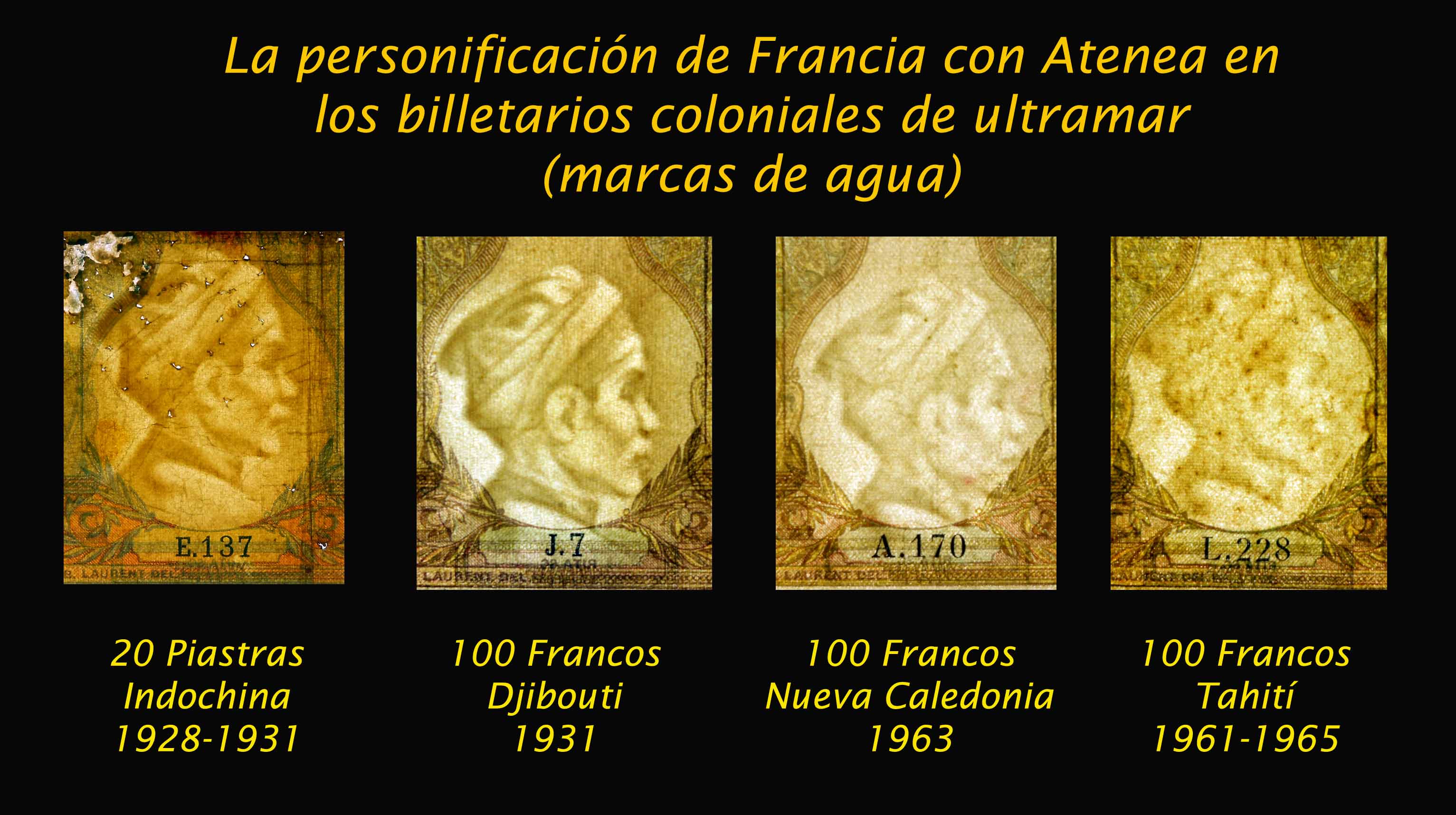Revisamos los billetes de 20 francos de Djibouti de 1928-38 en coloración lila amarronada y en coloración azulada, el ejemplar de 20 francos de Nueva Caledonia de 1929 y el billete de 5 piastras de Indochina de 1926. Todos ellos nos ofrecen en su anverso la alegoría de una joven dama coronada con una diadema de espigas, hojas y frutos, en clara alusión a la mitológica Ceres (o Deméter), diosa de la Agricultura, la Cosecha y la Fecundidad. Todo ello en un artístico marco con hojas y palmas, Bajo un diseño de los artistas franceses Clement Serveau / Emile Deloche (anverso) y Rita Dreyfuss / Roche (reverso), con textos en francés y números de serie en tipografía negra, combinan coloraciones predominantes según el destino de sus emisiones.