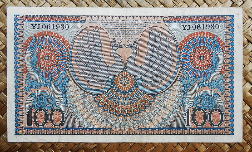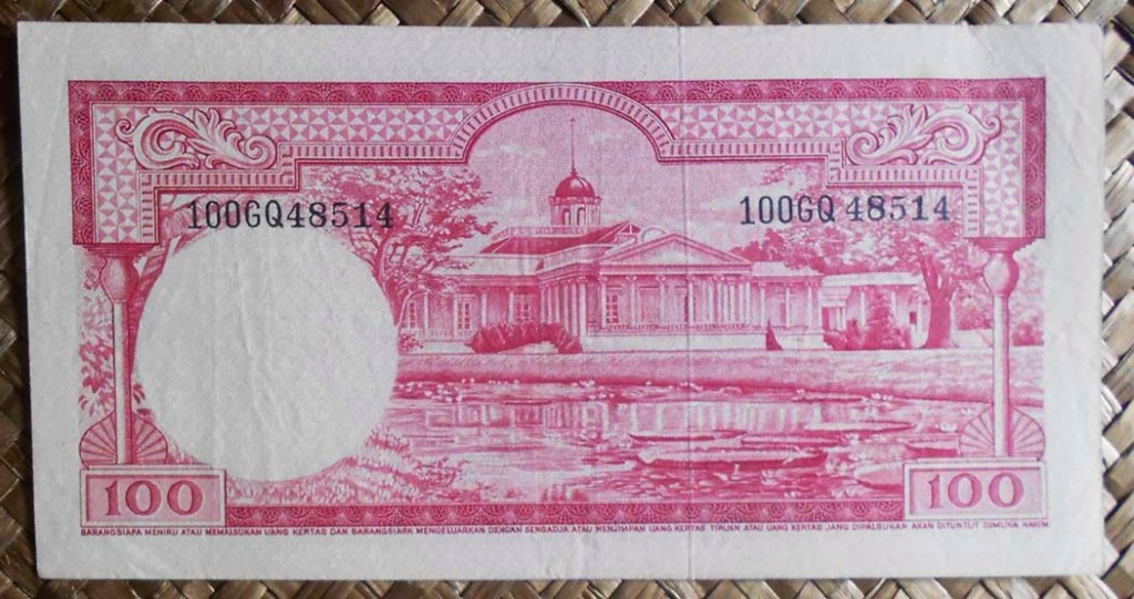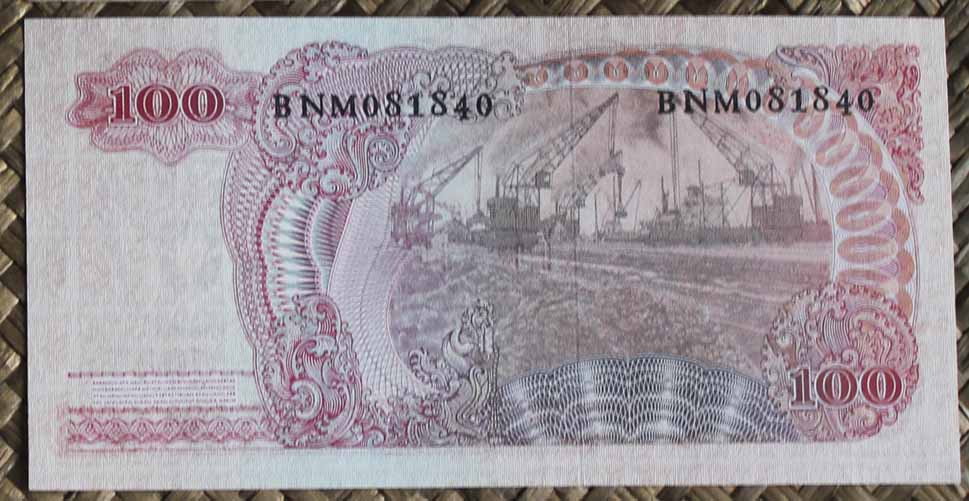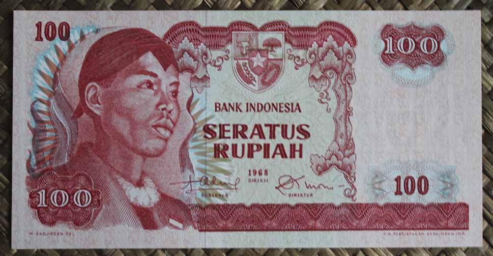 El billete de 100 rupias de Indonesia de 1968 nos muestra al revolucionario Sudirman en cromaticidad predominante rojo rosácea y para el reverso nos ofrece la vista aérea del puerto y muelles de carga de Tanjung Priok en la capital Yakarta.