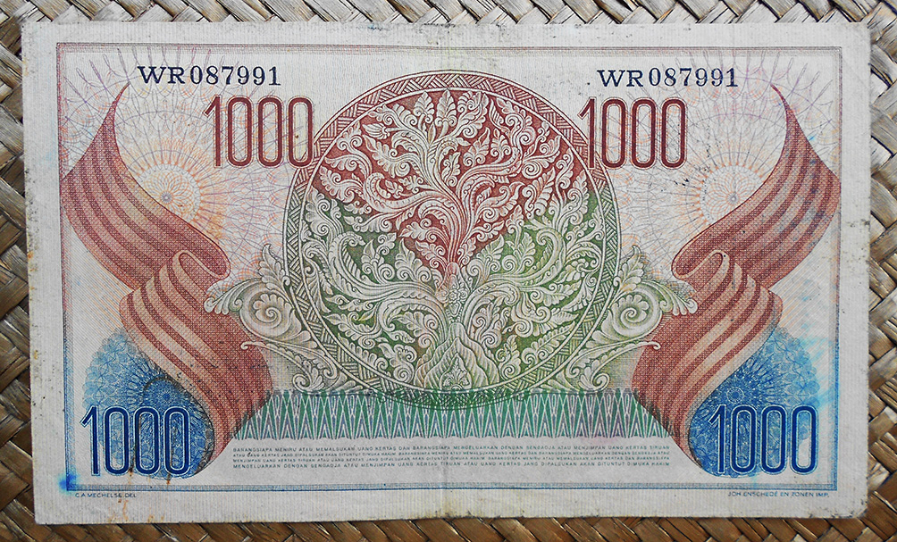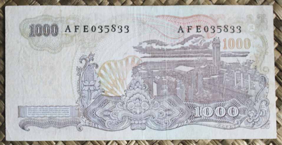 El billete de 1.000 rupias de Indonesia de 1968 nos muestra al General Sudirman en tono anaranjado sobre fondo marrón grisáceo. Para el reverso un grabado de una fábrica de fertilizantes.