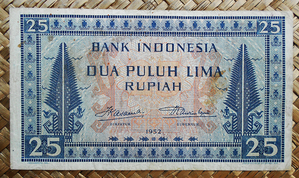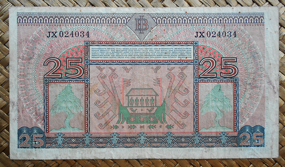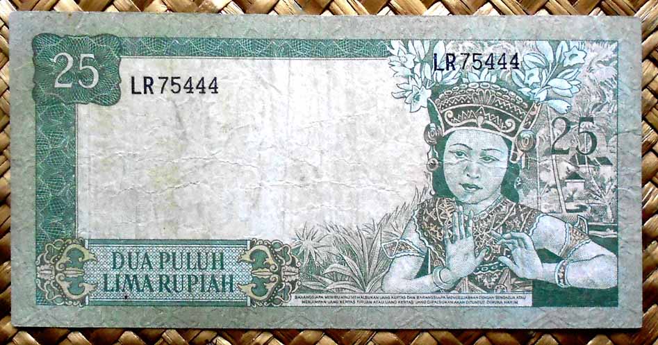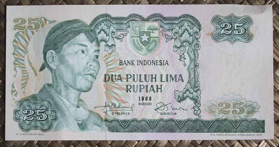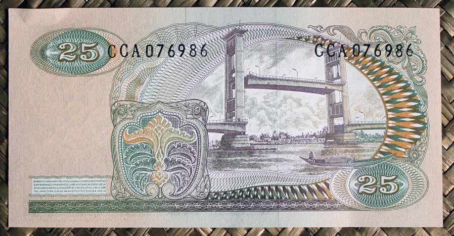 El ejemplar de 25 rupias de Indonesia de 1968 nos ofrece al héroe Sudirman en el anverso en tonos verdosos. Para el reverso nos muestra el puente levadizo Ampera sobre el río Musi, en la ciudad de Palembang en Sumatra del Sur.
