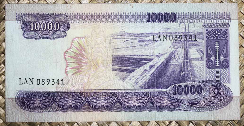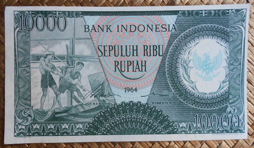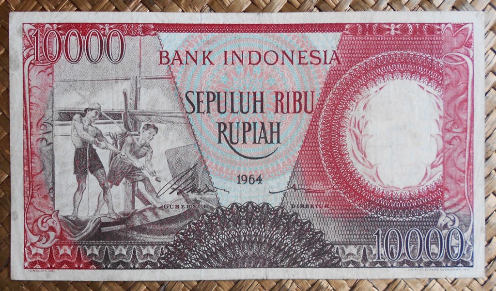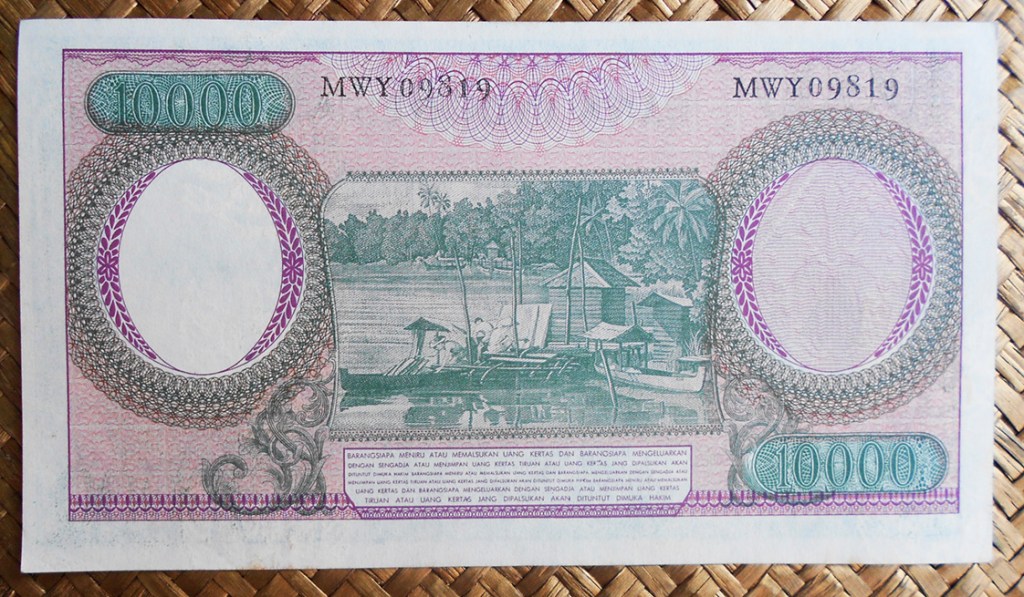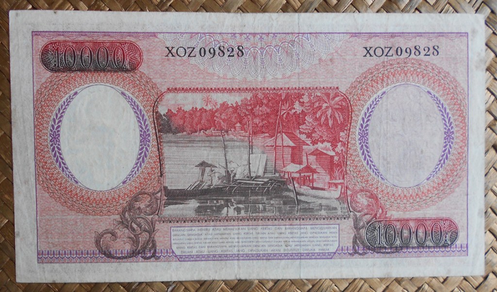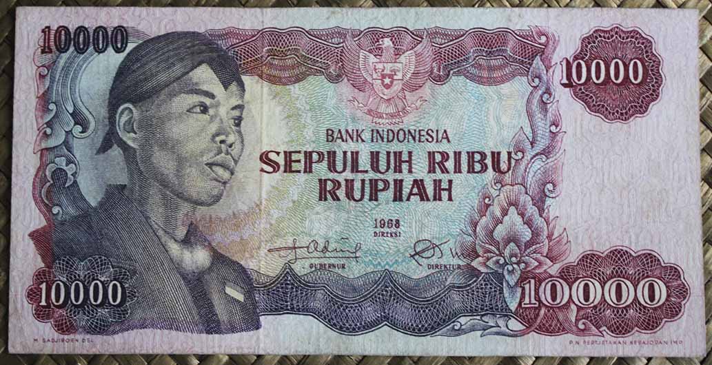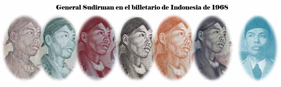 El ejemplar de 10.000 rupias de Indonesia de 1968 (1970) nos ofrece a Sudirman en tonos grises entre un fondo de cromaticidad predominante morada. En su reverso el grabado de minas de extracción de estaño en la isla de Bangka, al este de Sumatra; a su derecha un paño con bordado artesanal indonesio.