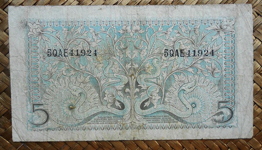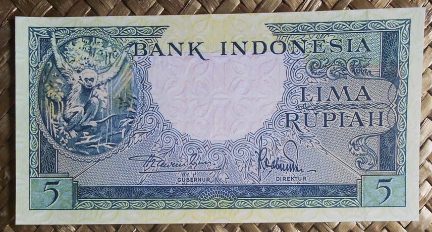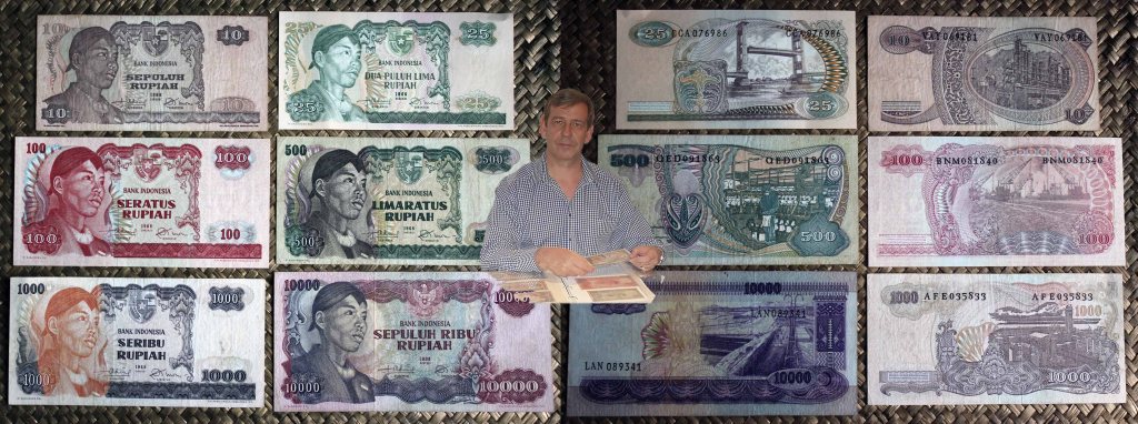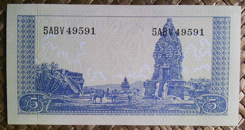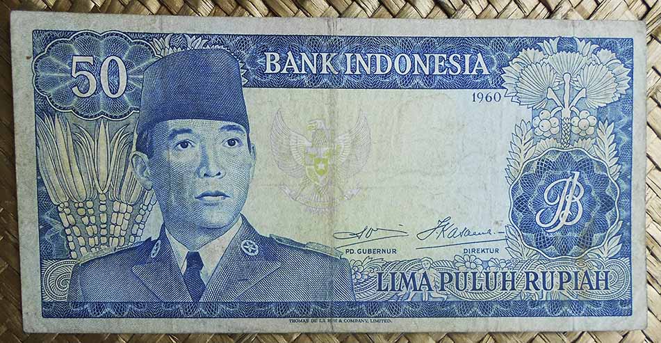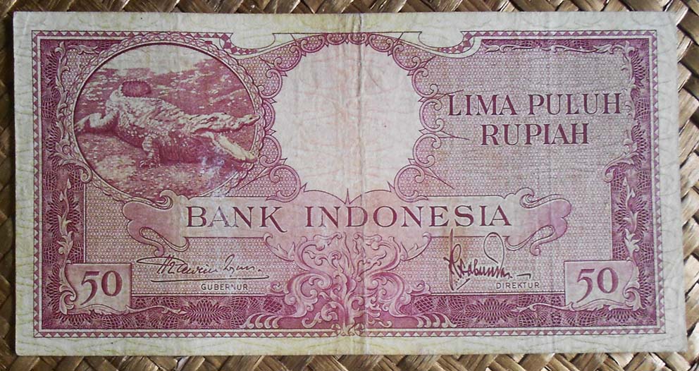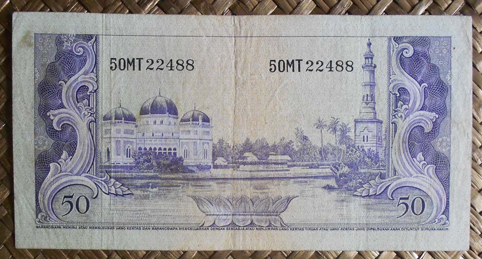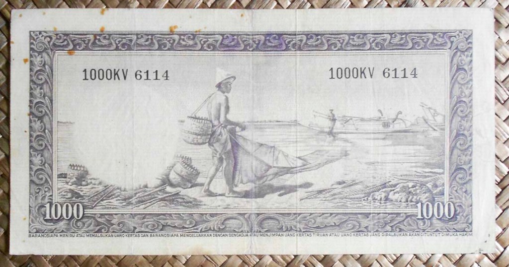 El ejemplar de 10.000 rupias de Indonesia de 1968 (1970) nos ofrece a Sudirman en tonos grises entre un fondo de cromaticidad predominante morada. En su reverso el grabado de minas de extracción de estaño en la isla de Bangka, al este de Sumatra; a su derecha un paño con bordado artesanal indonesio.