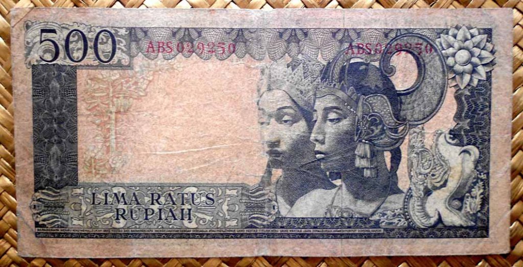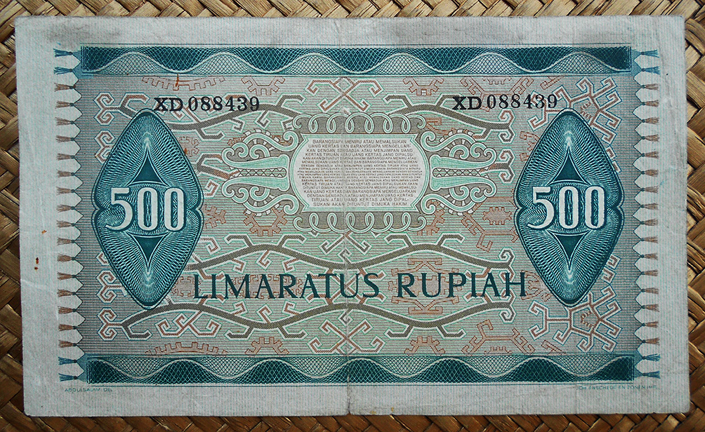 El ejemplar de 500 rupias de Indonesia de 1968 nos ofrece al maestro Sudirman en tonos grises sobre un fondo de cromaticidad verde rosácea. En el reverso nos dibujan una factoría manufacturera de rollos de algodón.