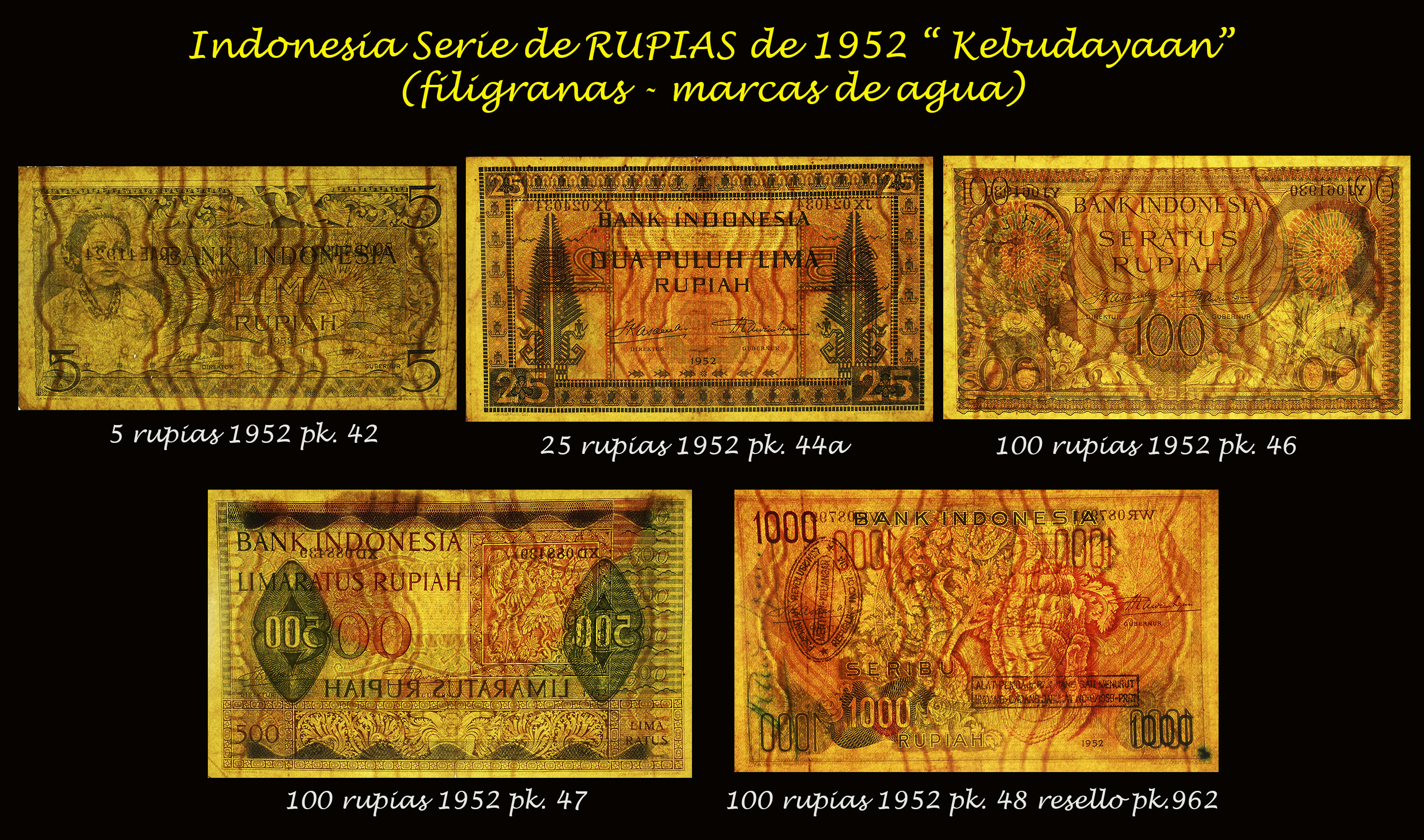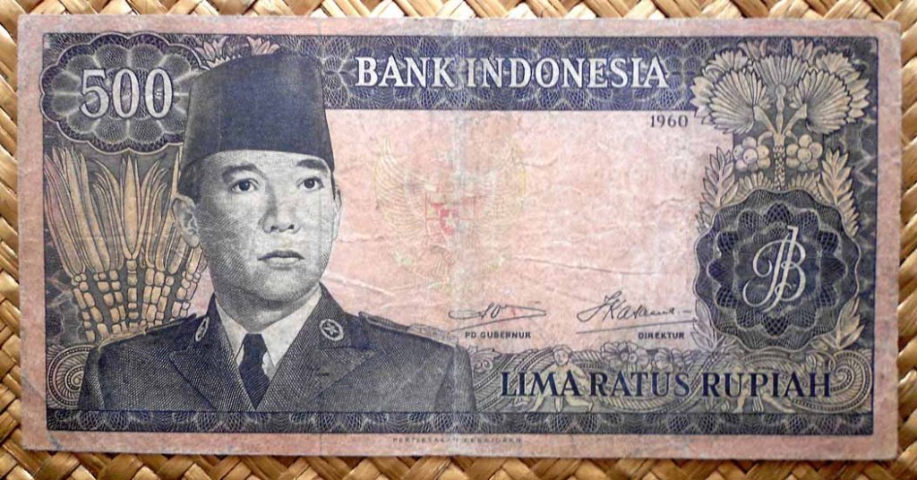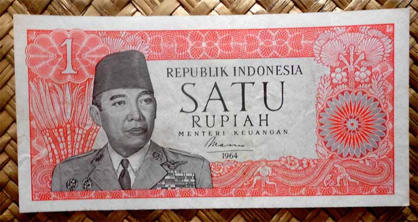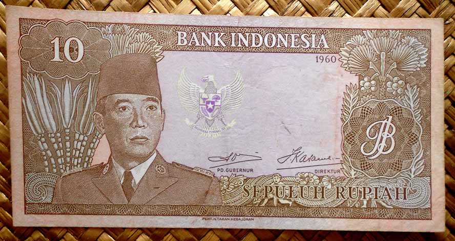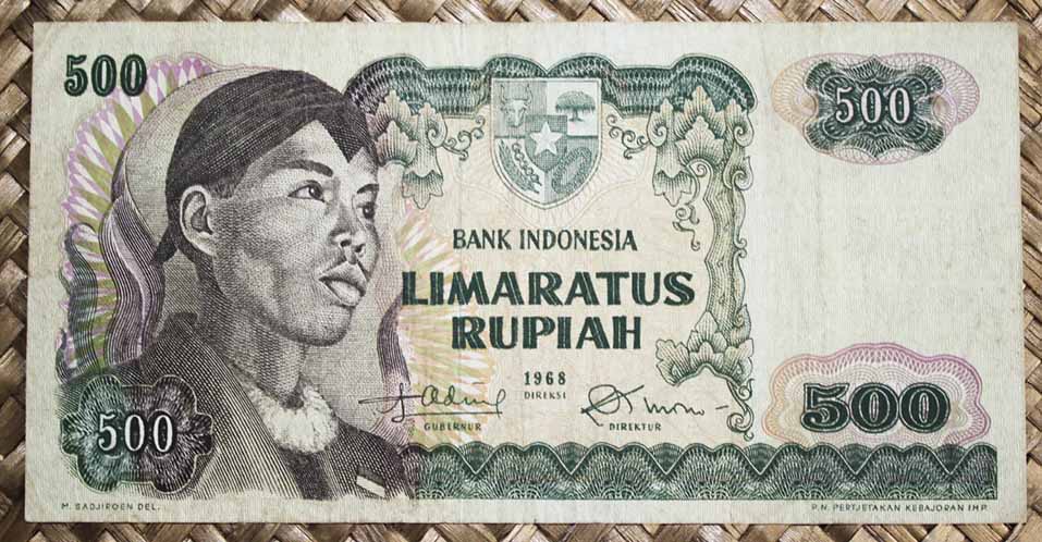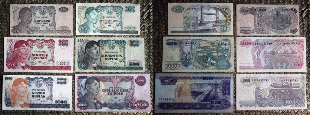 La serie que vamos a contemplar viene a reemplazar a la serie “Presidente Sukarno” de 1960. Revisamos los billetes de Indonesia de 10 rupias, 25 rupias, 100 rupias, 500 rupias, 1.000 rupias y 10.000 rupias de 1968. En todos sus anversos, en claro culto al personaje, nos presentan la imagen del General Sudirman, héroe revolucionario y primer Comandante de las Fuerzas Armadas Nacionales de Indonesia. Al centro superior se muestra el escudo de armas indonesio (sus cinco cuarteles son conocidos como “Pancasilla”, los cinco principios de la ideología nacional).