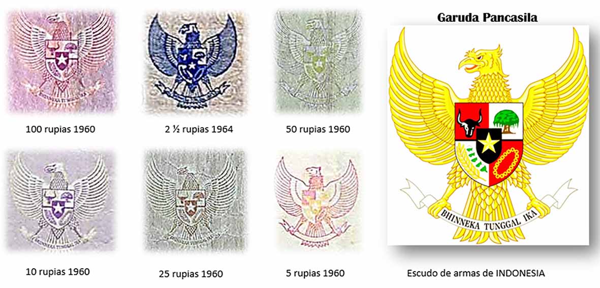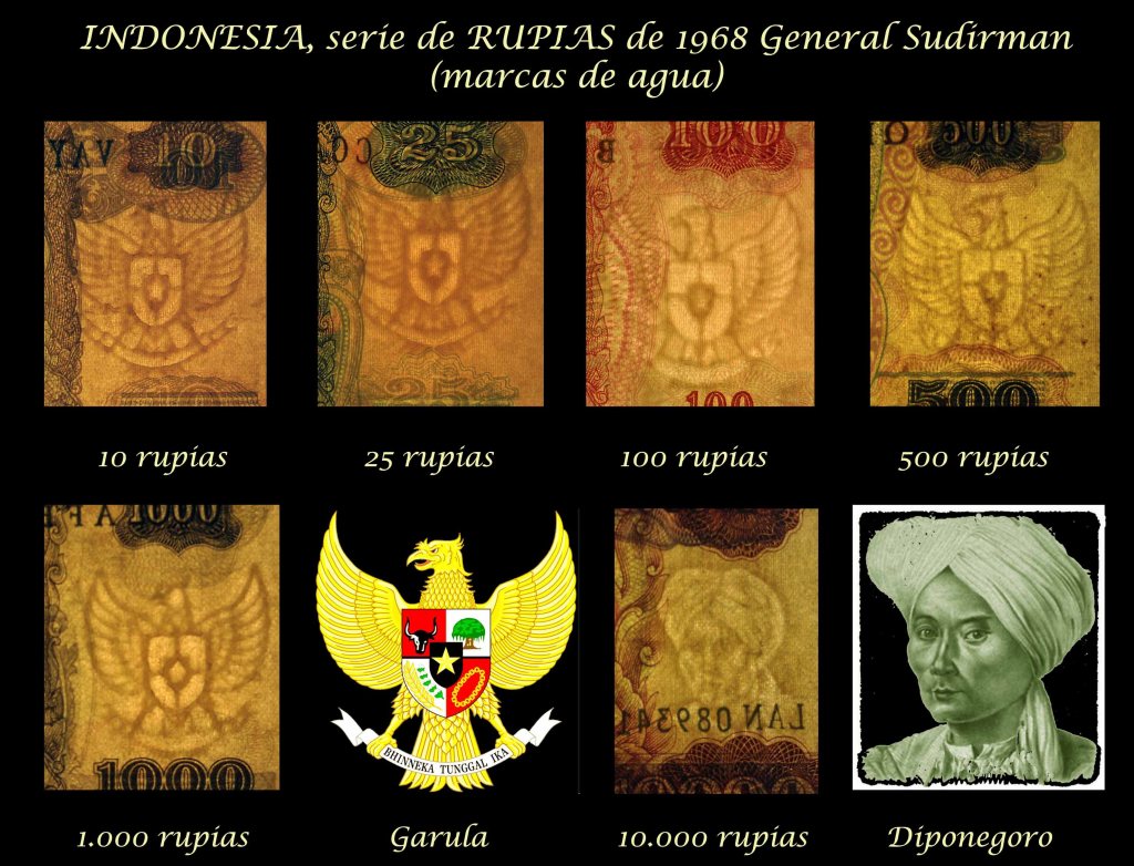 El halcón/águila “Garuda” formará parte de las marcas de agua de todos los valores de la serie, a excepción de los más altos, los billetes de 5.000 y 10.000 rupias que nos ofrecerán al Príncipe Diponegoro.