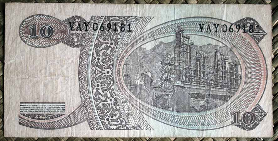 El billete de 10 rupias de Indonesia de 1968 nos muestra a Sudirman al anverso en cromaticidad predominante marrón. Para el reverso una vista aérea de una refinería petrolífera.