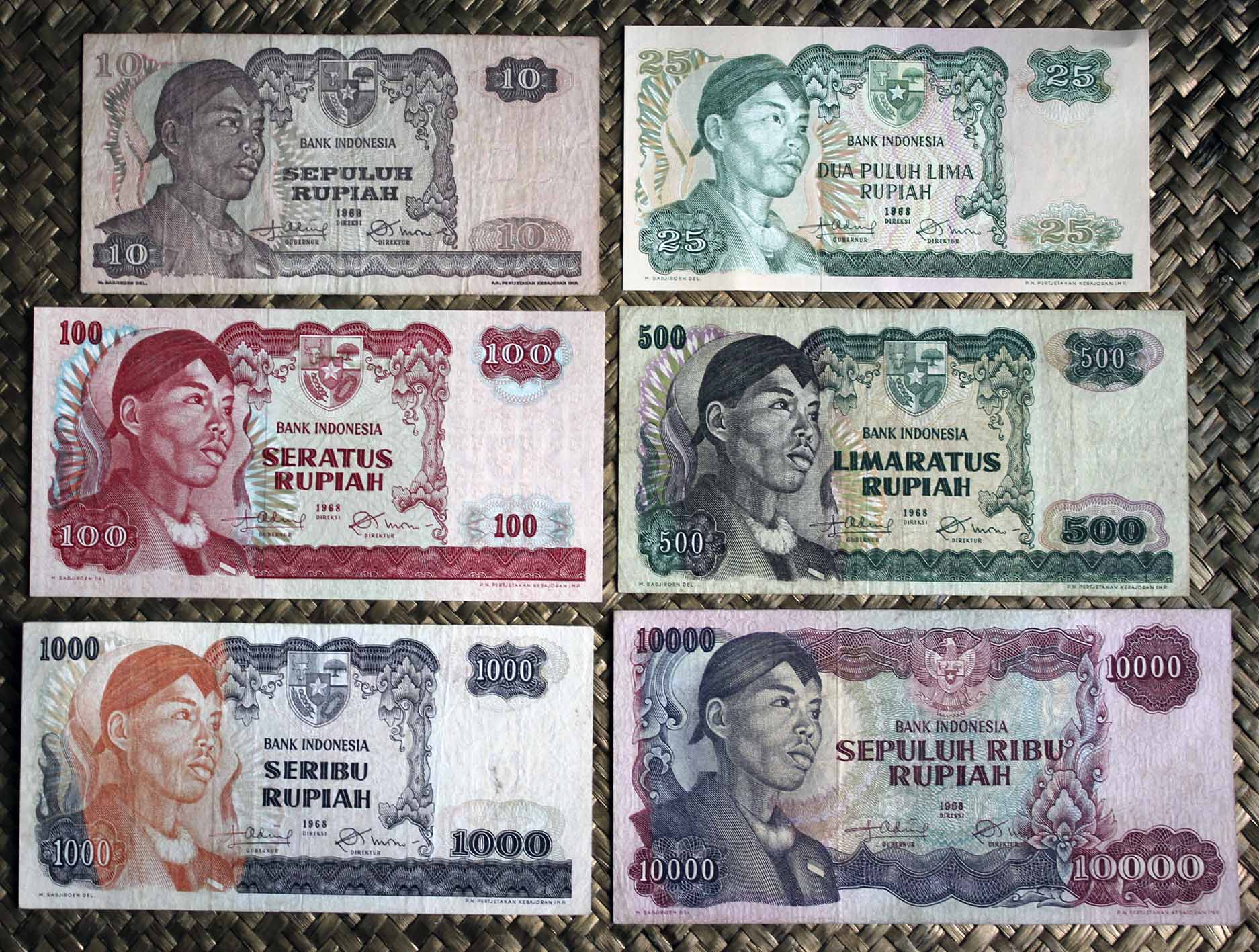 El Bank Indonesia obtuvo el derecho a emitir billetes y monedas con carácter exclusivo en 1968. La serie consta de 11 valores entre 1 rupia y 10.000 rupias, emitidos en 1968 (de 1 a 1.000 rp) y en 1970 (los de 5.000 y 10.000 rp). Fueron impresos por la imprenta estatal PN Pertjetakan Kebajoran de Yakarta. Llevan las firmas de Radius Prawiro y Soeksmono B. Martokoesoemo como Gubernur y Direktur respectivamente. Textos en indonesio.