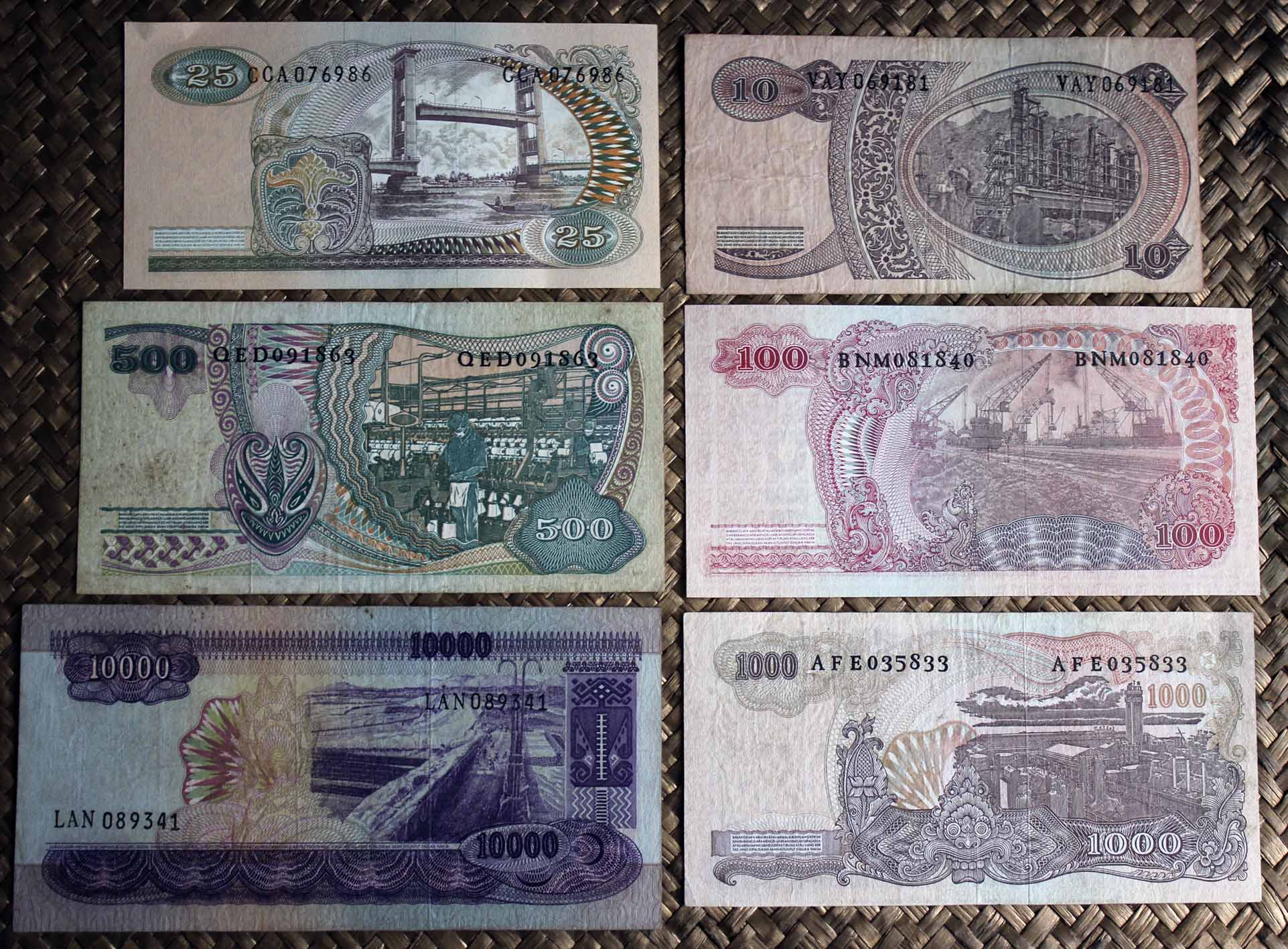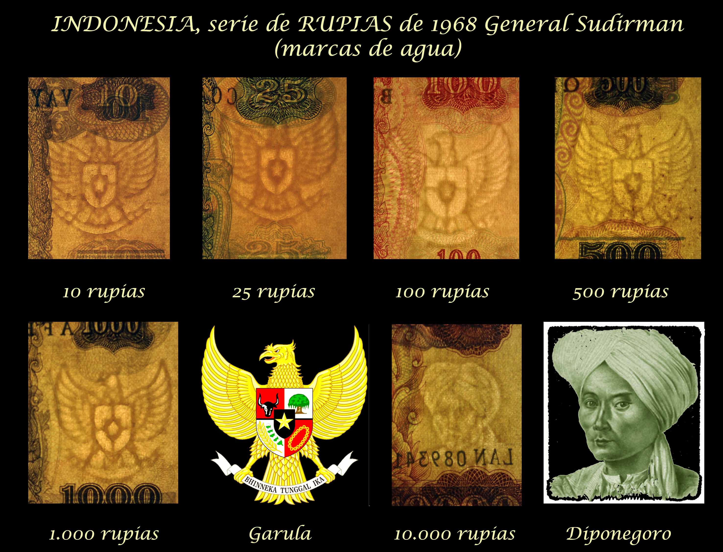 La serie que vamos a contemplar viene a reemplazar a la serie “Presidente Sukarno” de 1960. Revisamos los billetes de Indonesia de 10 rupias, 25 rupias, 100 rupias, 500 rupias, 1.000 rupias y 10.000 rupias de 1968. En todos sus anversos, en claro culto al personaje, nos presentan la imagen del General Sudirman, héroe revolucionario y primer Comandante de las Fuerzas Armadas Nacionales de Indonesia. Al centro superior se muestra el escudo de armas indonesio (sus cinco cuarteles son conocidos como “Pancasilla”, los cinco principios de la ideología nacional).