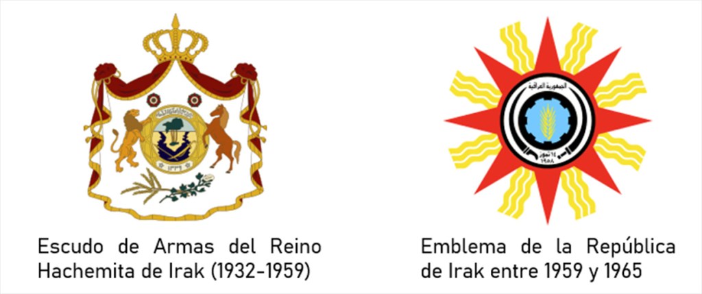 Escudos y emblemas del Irak monárquico y el Irak republicano, coronas frente a espigas y ruedas dentadas.