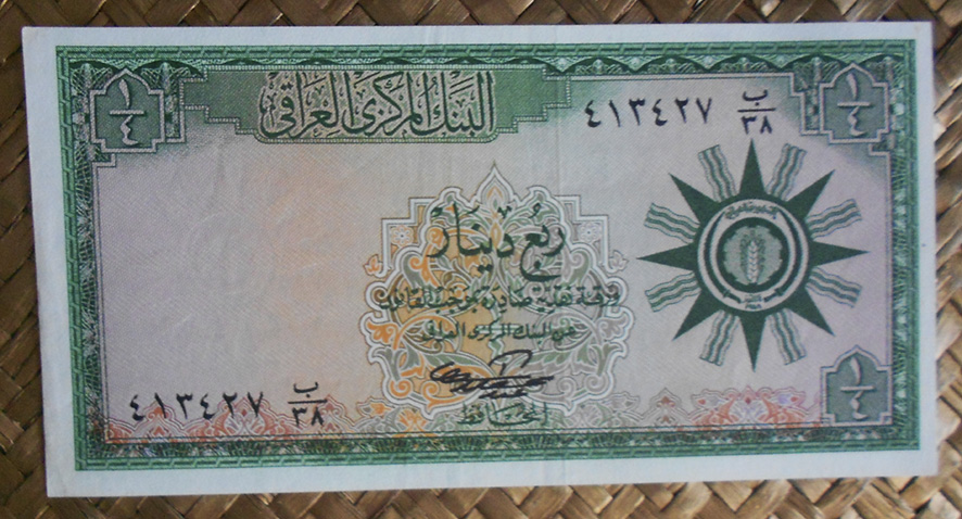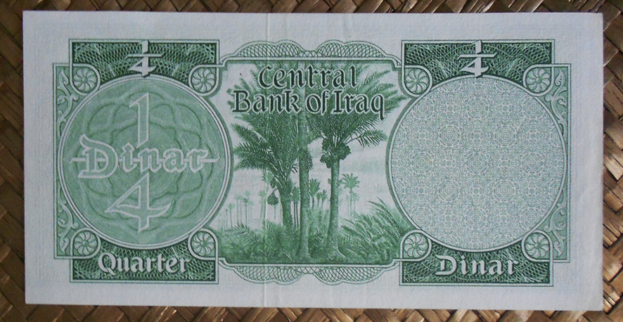 El billete de ¼ dinar de Irak de 1959 nos ofrece en tonalidades verdes el emblema de la República al anverso y un palmeral al reverso