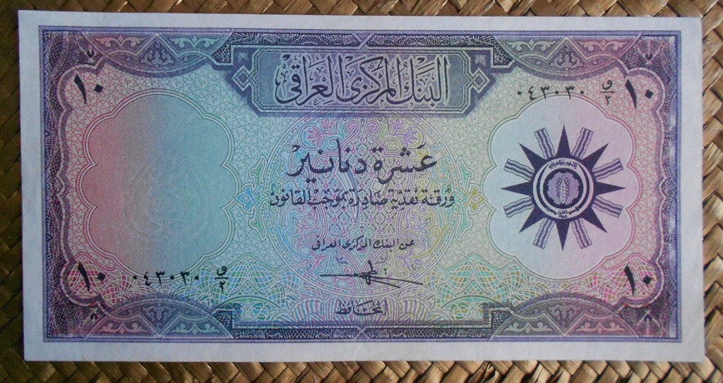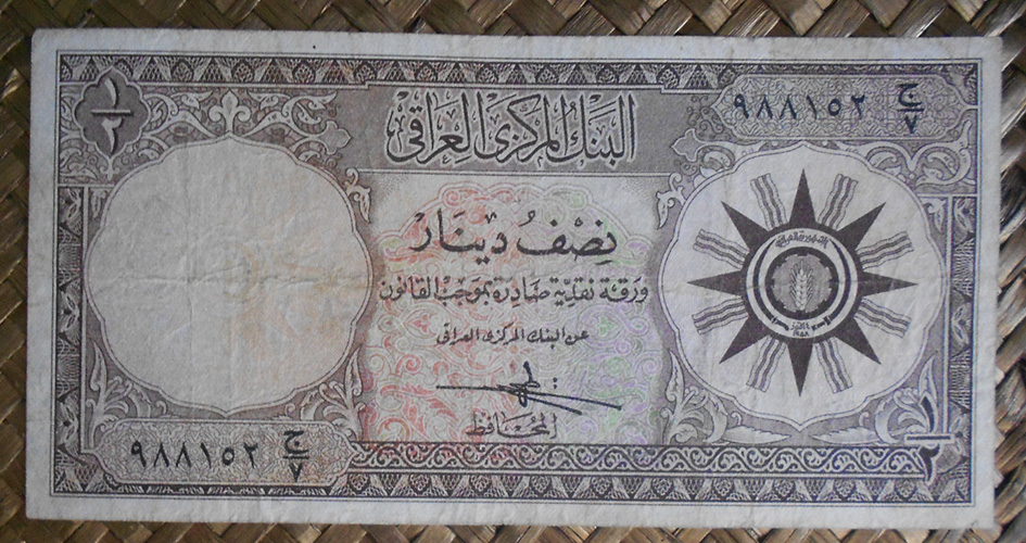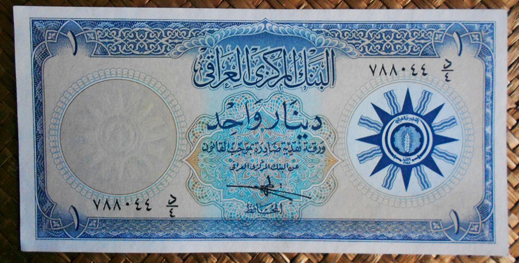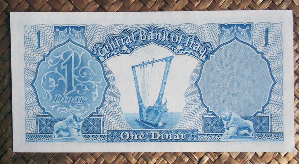 El billete de 1 dinar de Irak de 1959, en tonos azulados, nos muestra el emblema republicano al anverso. En el reverso vemos la Golden Lire of Ur (Lira de Oro de Ur), datada alrededor del año 2500 adC y encontrada en el cementerio real de Ur (ciudad sumeria de la antigua Mesopotamia, actual Irak). Se exhibía en el Museo de Antigüedades de Bagdad pero fue saqueado en la guerra con EEUU y los daños ocasionados han requerido de una completa restauración.