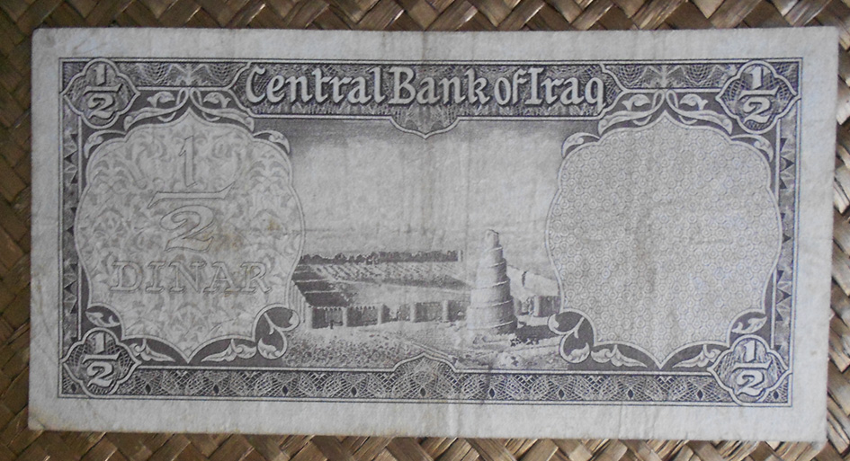 El billete de ½ dinar de Irak de 1959 nos muestra en tonos marrones el emblema de la República al anverso; para el reverso nos guarda una vista aérea de la Gran Mezquita de Samarra con su característico minarete en espiral. Es una construcción del s. IX y es Patrimonio de la Humanidad por la UNESCO desde 2007.
