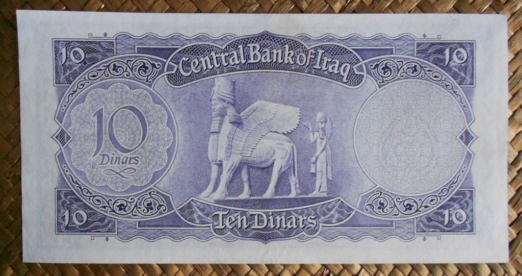 El billete de 10 dinares de Irak de 1959, en tonalidad púrpura, nos muestra al anverso el emblema de la República y al reverso la escultura de un toro asirio alado junto a un sacerdote. Reproduce una escultura del Palacio de Sargon II de Khorsabad. Estos toros alados con cabeza humana, conocidos como Iamassu, datan del Imperio neoasirio (s. X al VII adC) y formaban parte de los pórticos y relieves de palacios imperiales.