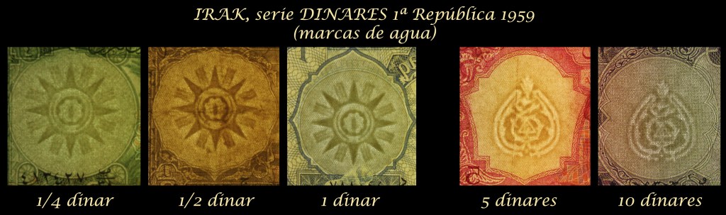 Sus marcas de agua nos ofrecen el Emblema de la República en 1959 (lo veremos en los ejemplares de ¼ dinar, ½ dinar y 1 dinar) y el Escudo de Armas del anterior Reino de Irak , de 1932 a 1959 (lo veremos en los valores mayores, de 5 y 10 dinares)