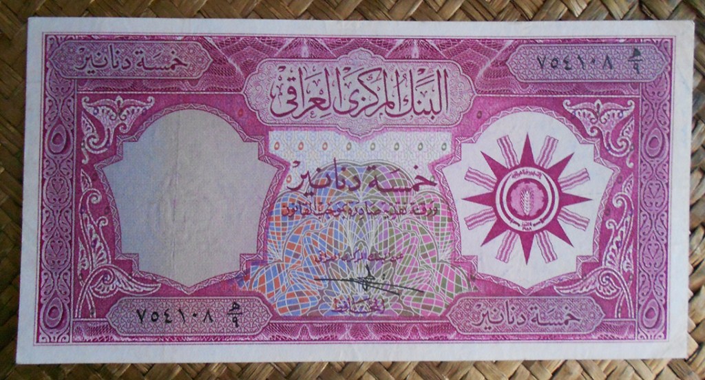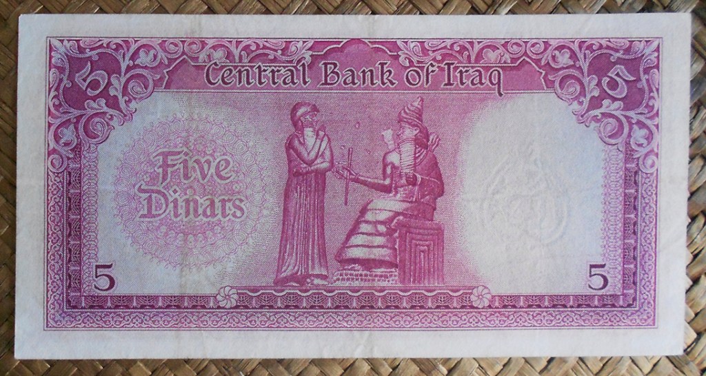 El billete de 5 dinares de Irak de 1959, en tonalidad rosácea, nos ofrece al anverso el emblema republicano y al reverso nos deleita con la representación del Rey babilonio Hammurabi (de pie) recibiendo las insignias reales de mano del dios Shamash (dios mesopotámico del sol y la justicia, sentado).
