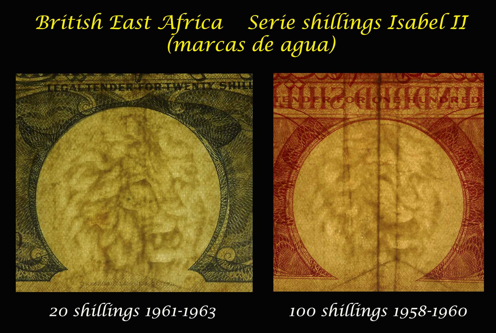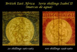 Sus marcas de agua nos muestran: en el billete de 5£ de 1961-63 la cabeza de Britannia con casco con penacho y una trama matricial alrededor del marco; para los billetes de 10 sh. 1£ y 5£ la efigie de Britannia de perfil con una diadema de laurel en una composición repetitiva en vertical y para el billete de 10£ de 1970-75 la cabeza de la reina con la diadema del rey Jorge IV en el medallón central.