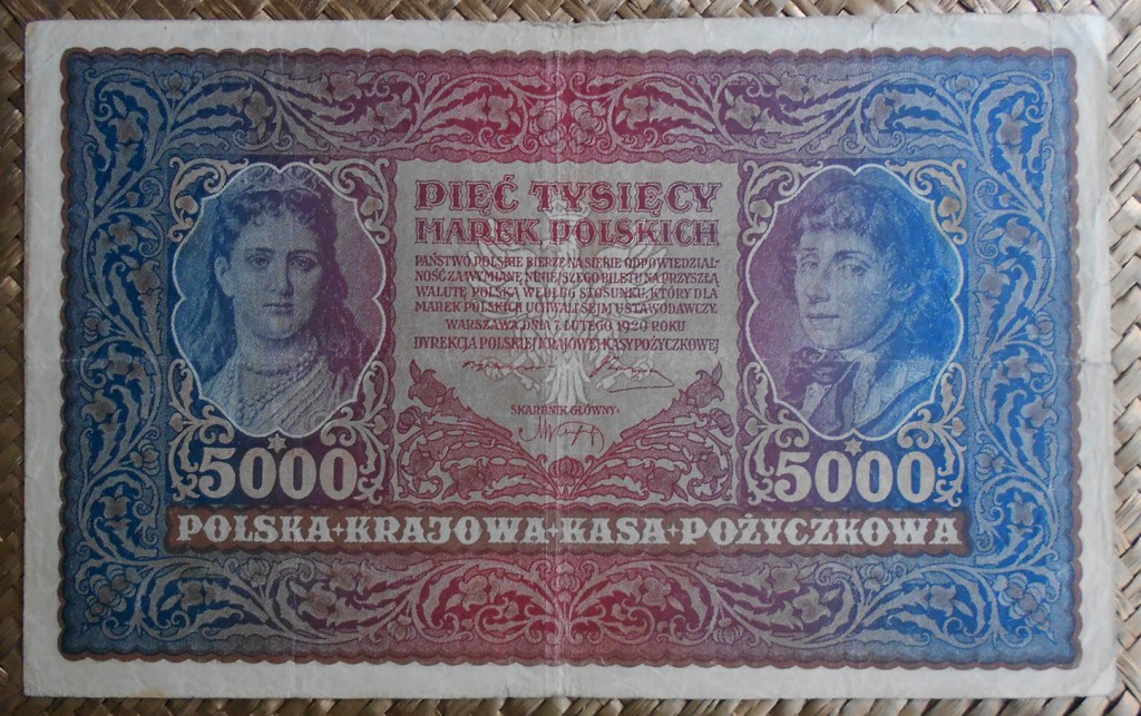 Y para el valor mayor, el de 5000 marek de 1920 nos juntaron a ambos en su anverso, contemplando en él a Tadeusz Kosciuszko a la derecha y al rey Jadwiga a la izquierda.