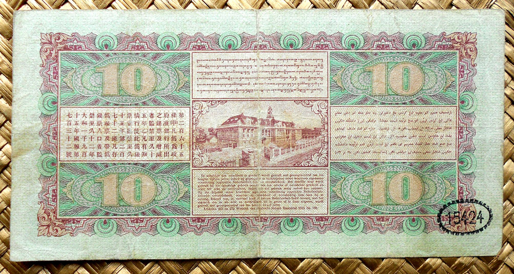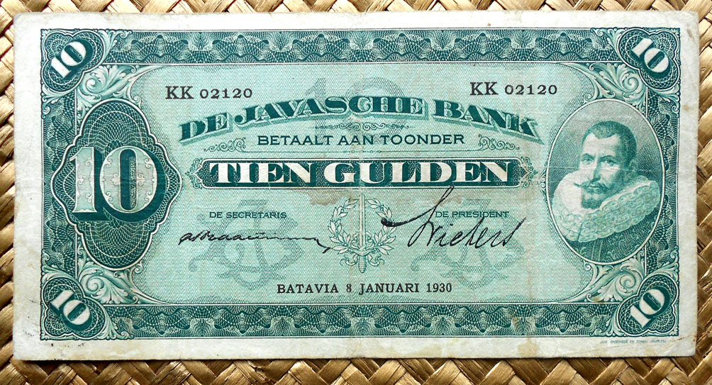 El billete de 10 florines de 1930 de las Indias Holandesas, de cromaticidad verde, nos muestra al anverso al fundador de Batavia, actual Yakarta, y al reverso el edificio del Banco