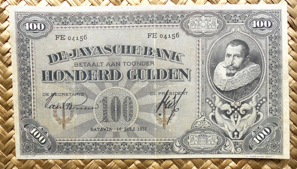 Por último, el billete de 100 florines de 1927 de las Indias Holandesas es el más austero en coloración, de cromaticidad grisácea, repite las viñetas de los anteriores, Pieterszoon en anverso y edificio del Javasche Bank en reverso.