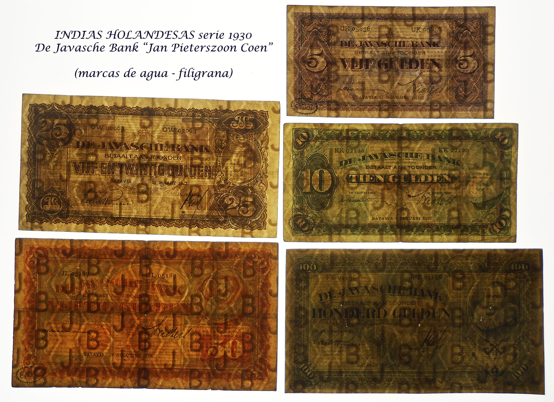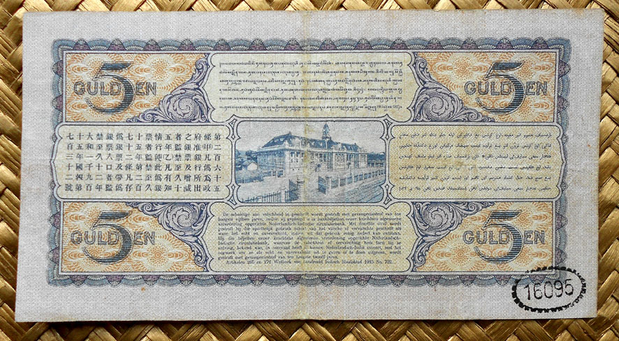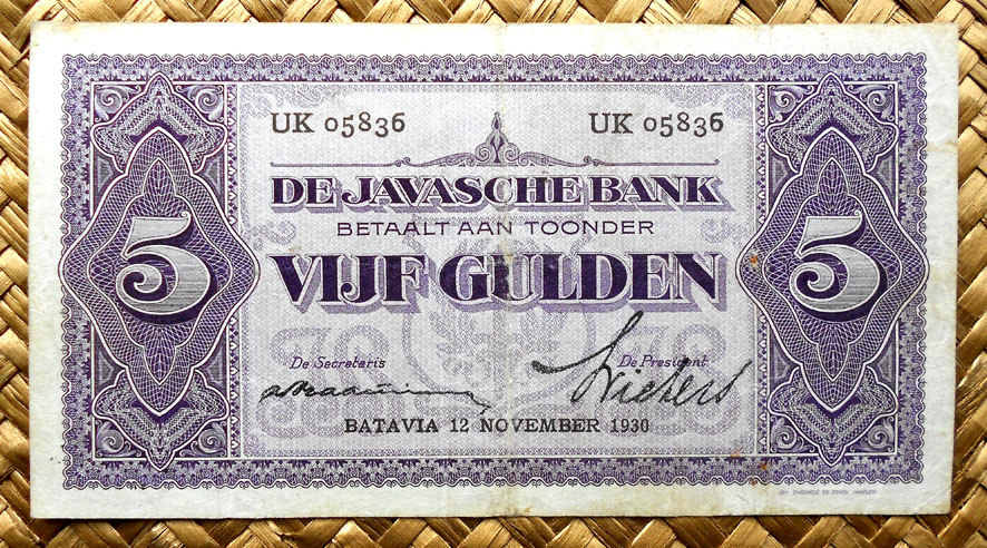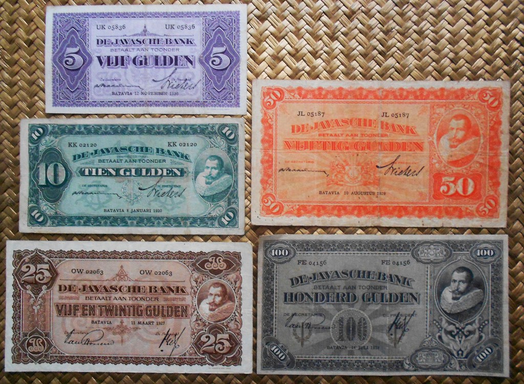 El billete de 5 florines de 1930 de las Indias Holandesas, de cromaticidad color malva rosado, es el único que no muestra en su anverso a Jan Pieterszoon. En el reverso sí ofrece una vista del edificio del Javasche Bank de Batavia.