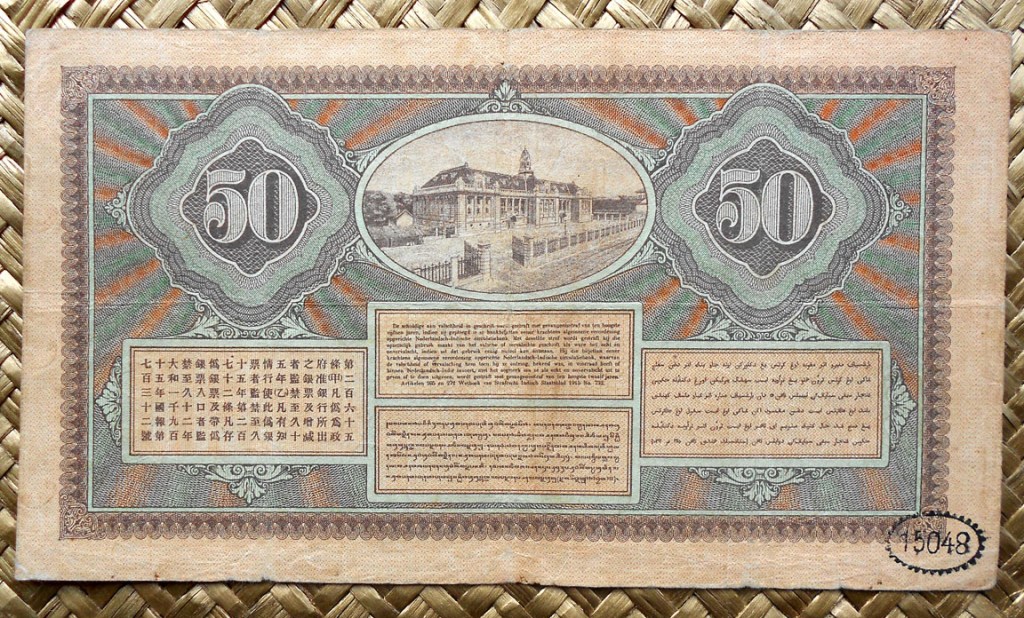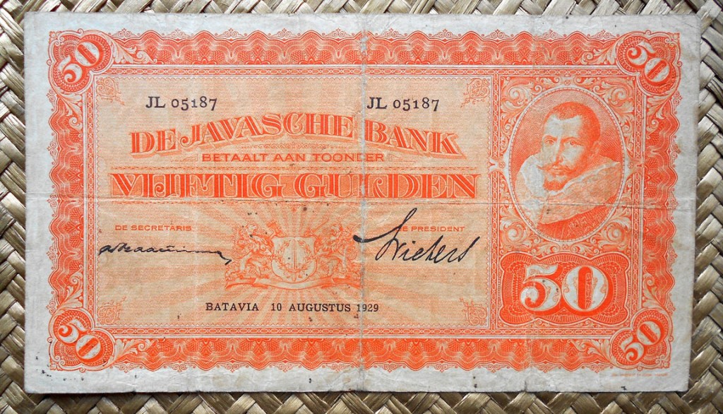 El billete de 50 florines de 1929 de las Indias Holandesas se imprime en un color naranja fuerte, siendo el más vistoso de la serie. También nos ofrece a Jan Pieterszoon al anverso y el edificio bancario de su capital al reverso.