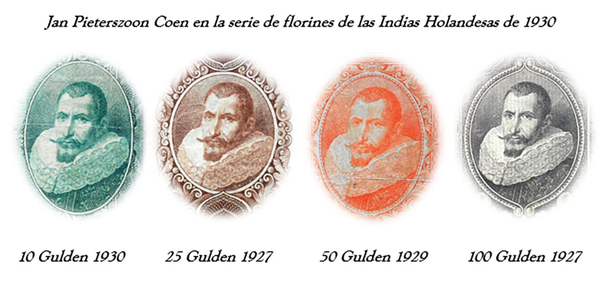El Javasche Bank de Batavia (actual Yakarta, en la isla de Java) emitió en la segunda década del s. XX una serie de billetes con la imagen de Jan Pieterszoon Coen, con cuello de volantes (muy común en la representación de conquistadores) en sus anversos y en sus reversos una grabado central del edificio del Javasche Bank de la época.