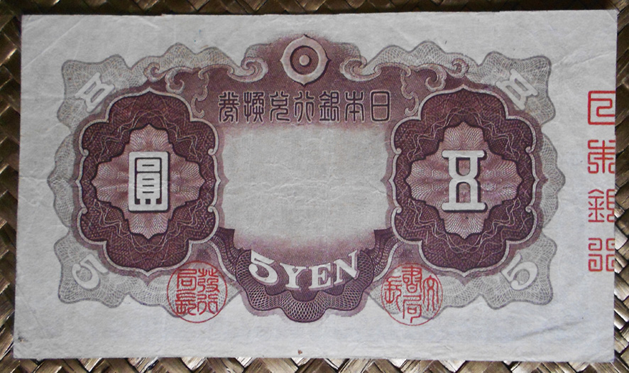 Para los reversos introducen textos en inglés, además del japonés. El sello rojo estilo tensho de este lado es del Director General de la Oficina de Emisión Monetaria del Banco. Los grabados nos ofrecen desde una vista del edificio Yumedono del parque Horyuji en el billete de 1.000 yen, al edificio del Banco de Japón en Tokio (construido en 1896) en el billete de 5.000 yen, o un marco de rosetas y guilloches que encierra una multicolor composición simétrica con apariencia ornitológica en el ejemplar de 10.000 yen.