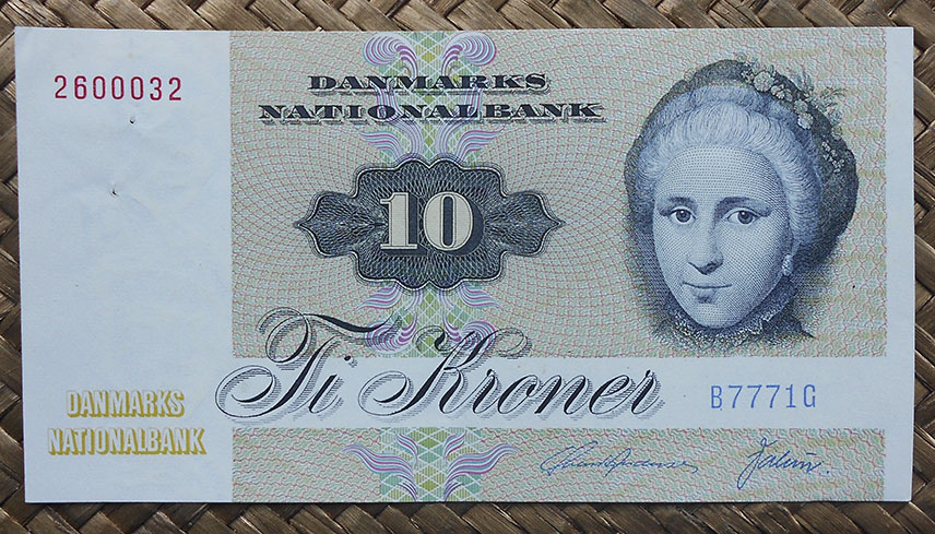 El billete de 10 coronas de Dinamarca de 1977 nos ofrece en su anverso el retrato de Catherine Sophie Kirchhoff (esposa de Johan Henrik Kirchhoff, Consejero de Estado) pintado por Jens Juel en 1768. Veremos en su reverso la imagen de un pato, extraído de una acuarela de 1909, «Queen eider», del pintor y artista gráfico Johannes Larsen (1867-1961).